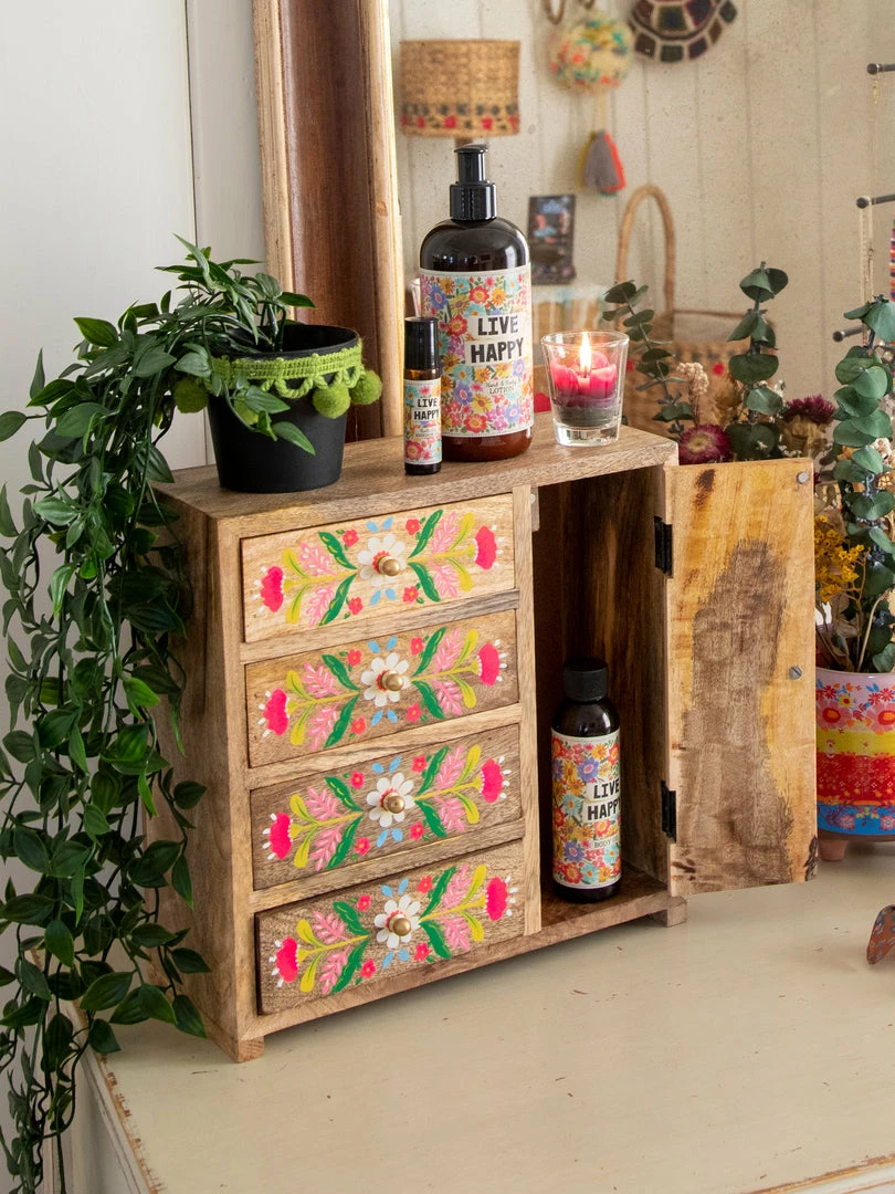 The Aria Dresser Cabinet is the cutest mini dresser to put on your big one! It features a natural wood finish with hand-painted florals and doors & drawers for storing all your treasures and fun little things!