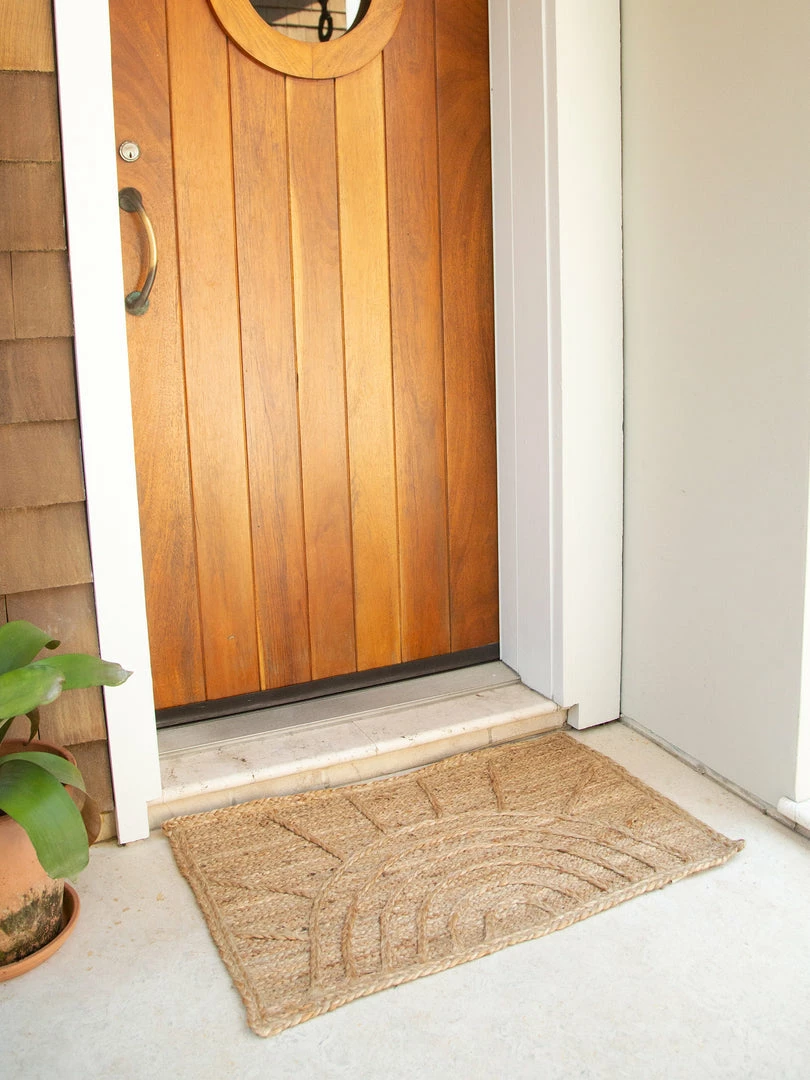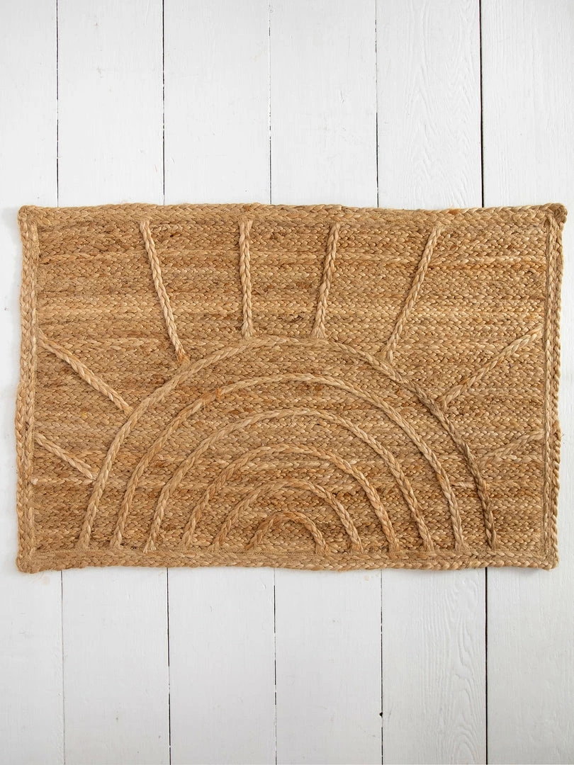 The perfect back, side or front door rug! This beautiful Jute Rug is crafted and woven from natural fibers with a braided overlay in the shape of a sun. Hello Sunshine! We recommend using a rug pad to prevent slippage and protect your floor!