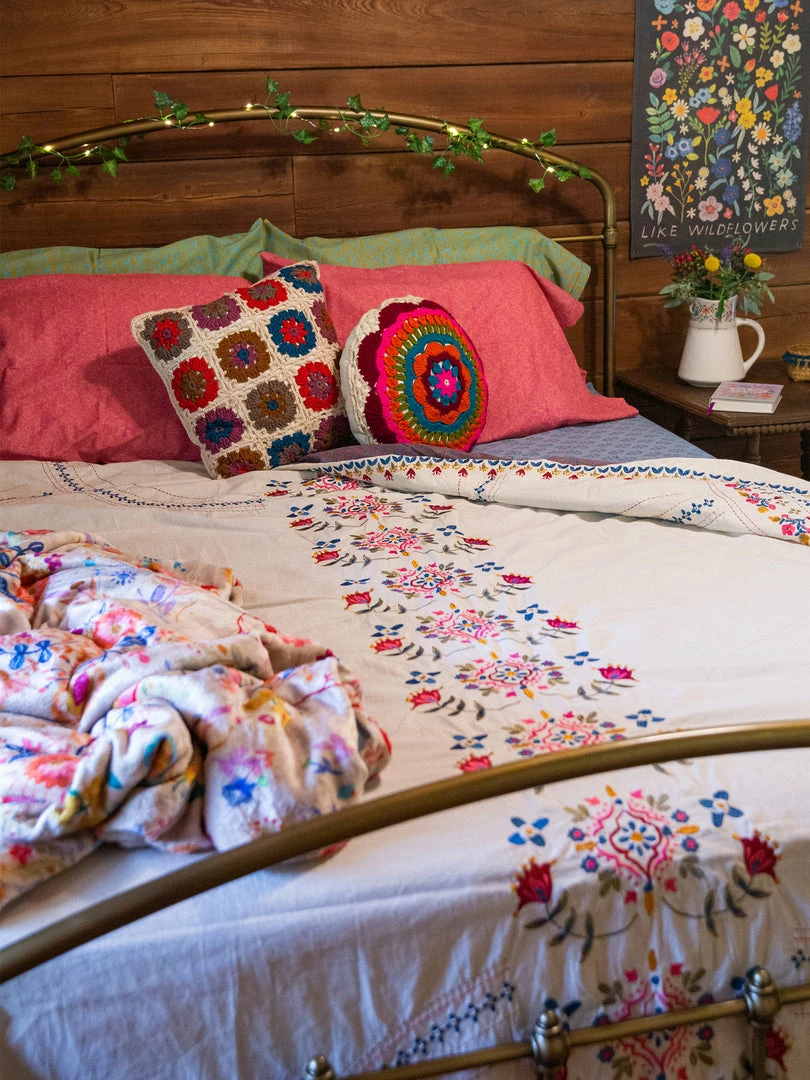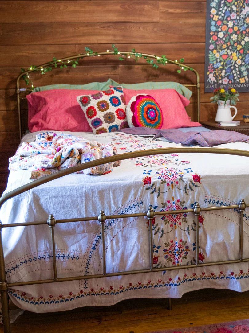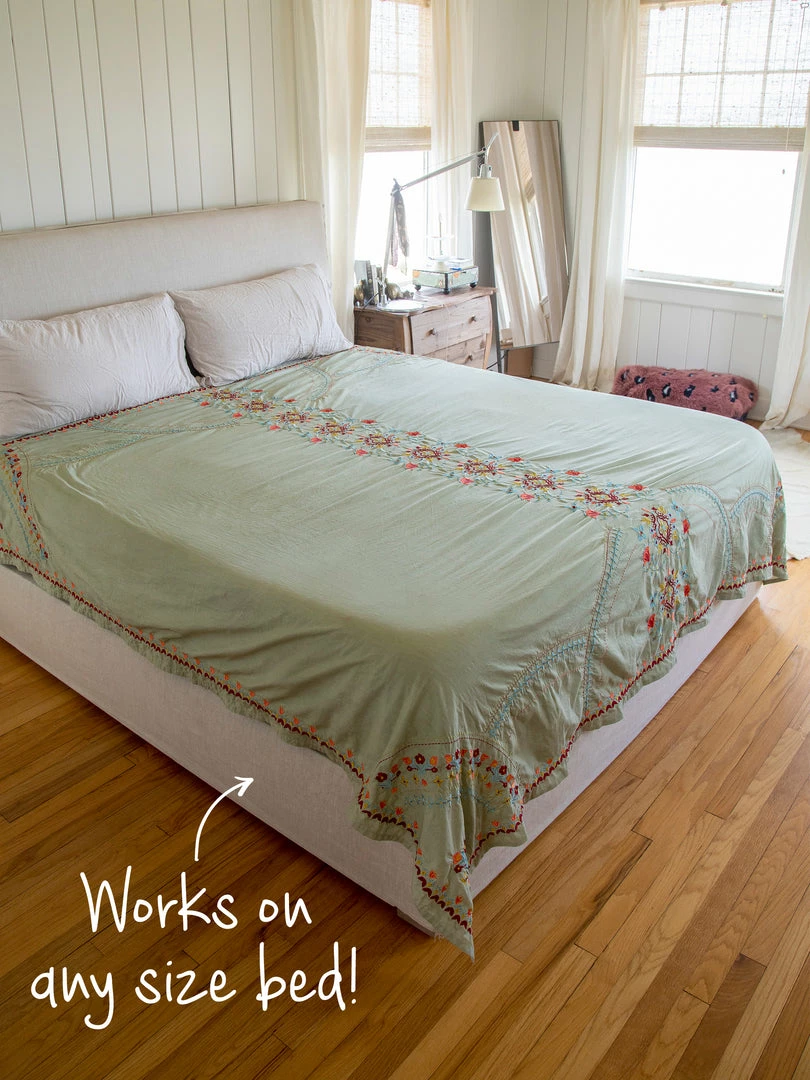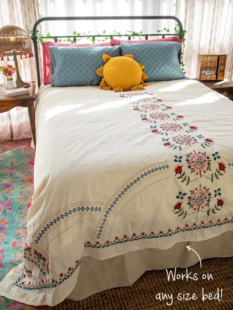 The Embroidered Coverlet is so beautiful! It’s a lightweight, embroidered king size coverlet that actually looks great on ALL bed sizes! Throw it on your bed or keep it folded at the foot for an extra layer of warmth and decoration… it will make your bedroom or dorm room come to life! We even like using it as a table cover, it’s just so pretty!