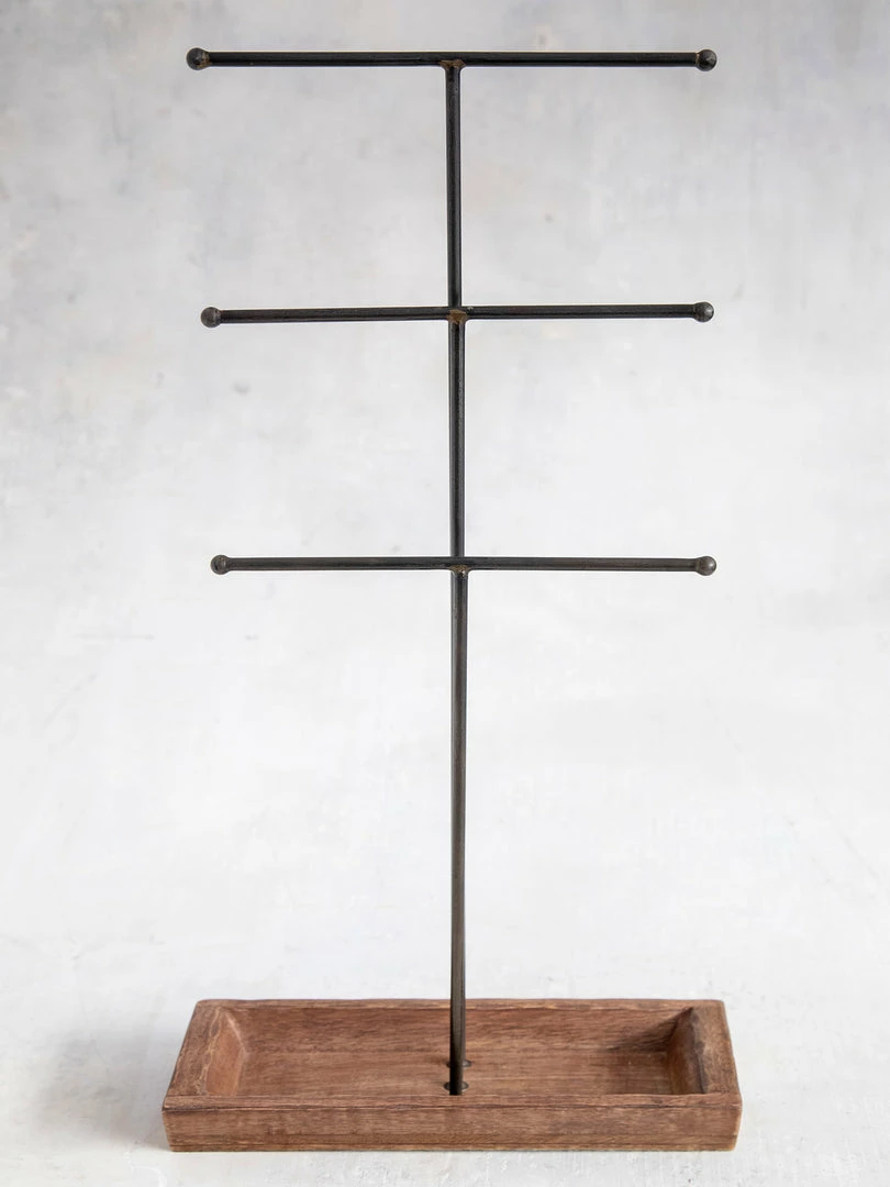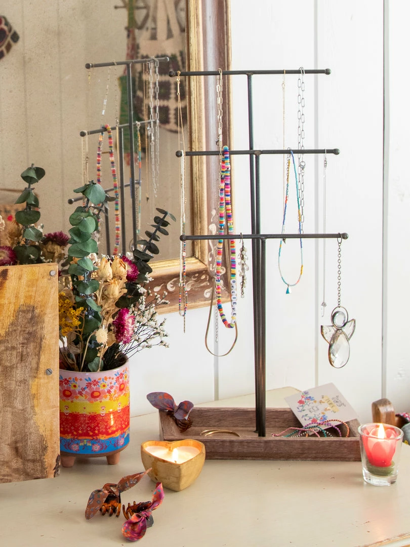 Our jewelry is too pretty to not show off! Hang your necklaces, bracelets & rings on this tabletop Wooden Jewelry Stand for everyone to see! It features a mango wood tray and 3 metal holders for displaying your accessories… it makes the perfect piece for your nightstand, dresser or vanity!