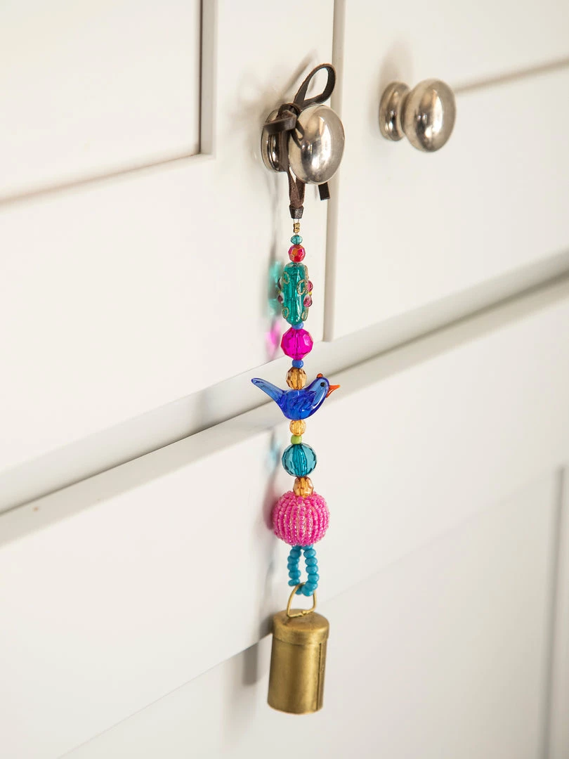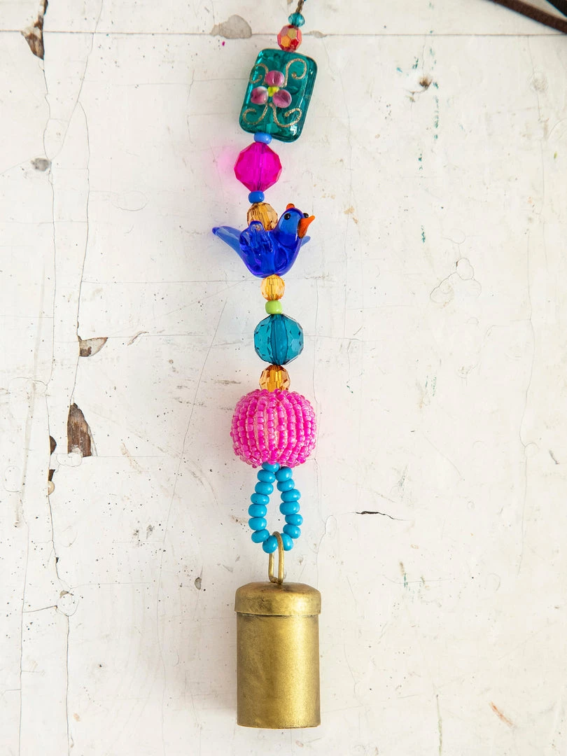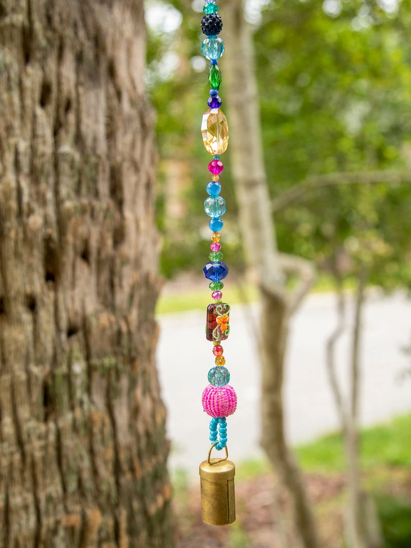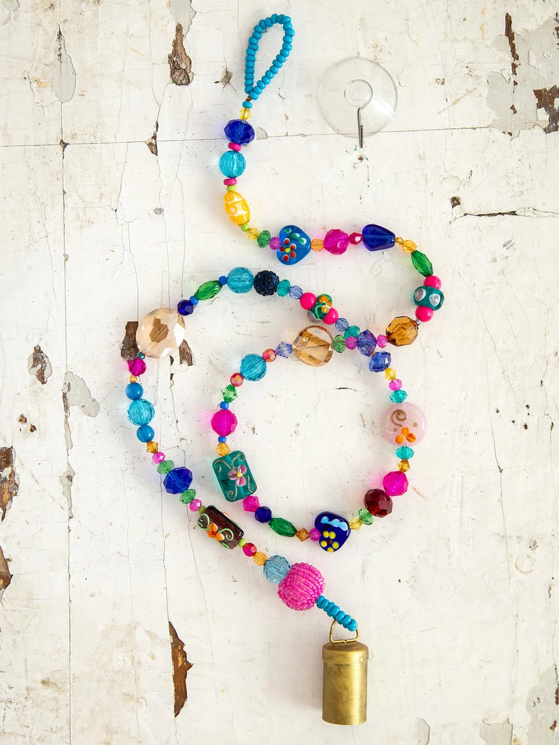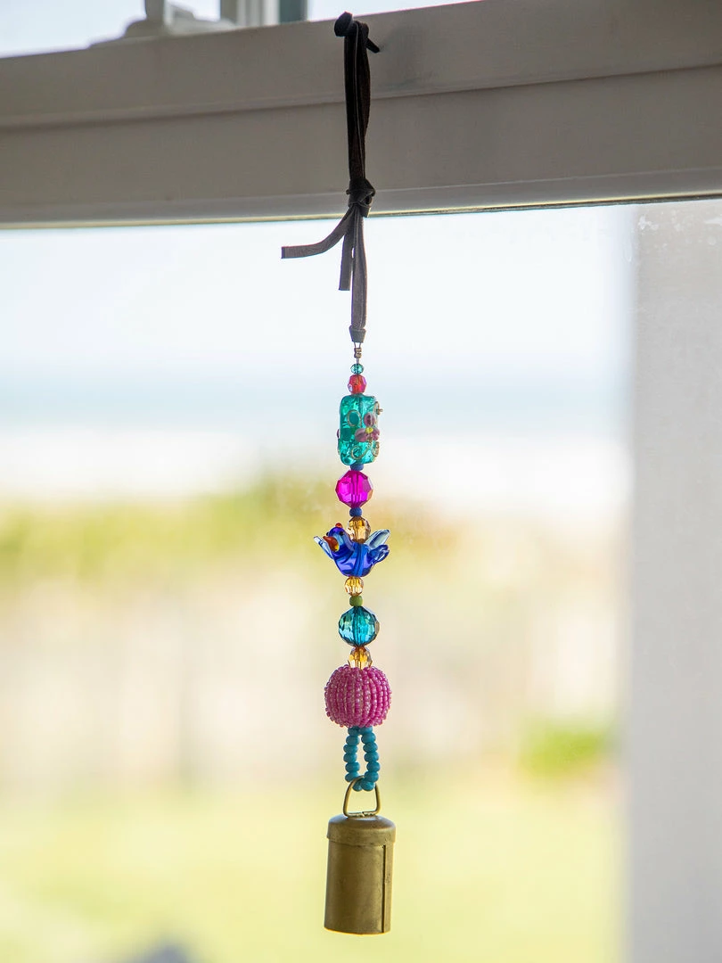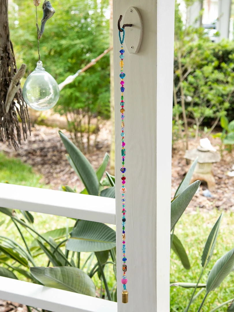 The Boho Beaded Bell is such a fun addition to your space! The shorter one is perfect for your door knob, a window, your kitchen or hanging from your purse and the longer one is so cute on your porch or hanging from your tree as a windchime! It features a metal bell on the end a strand of beaded glass and comes with a loop at the top for easy hanging!