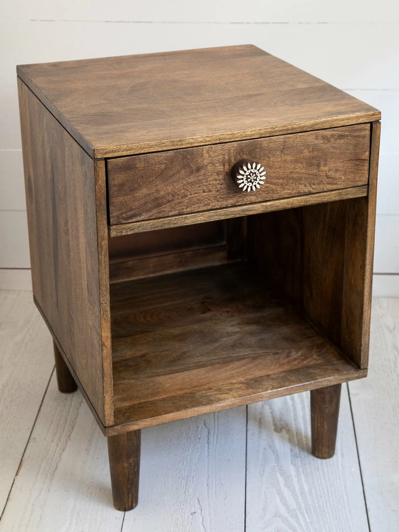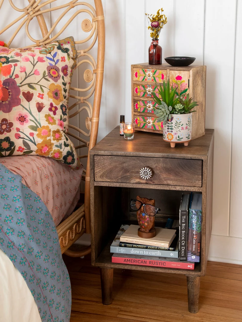 The Bungalow Nightstand is such a classic piece that will bring a bohemian & rustic touch to your space! The top drawer has a cute hand-carved block print drawer pull and a bottom shelf that’s perfect for displaying home décor! The most special part are the drawer pulls, they are so unique and we discovered them during our global travels! The nightstand is a stained mango wood, so there will be slight variations in wood color and grain. Each piece is uniquely one of a kind! Some assembly is required and instructions are included.