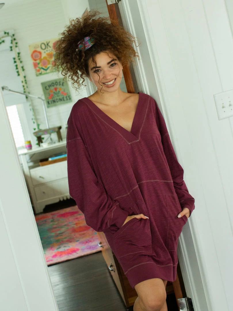Everyone loved our Johnnie Jumpsuit so much, we made it into a dress! This knit dress features contrast stitching, a deep v-neckline and even has pockets! It’s so incredibly comfy, you’ll want to live in it! If you’re in between sizes, we recommend sizing down due to it’s generous fit.