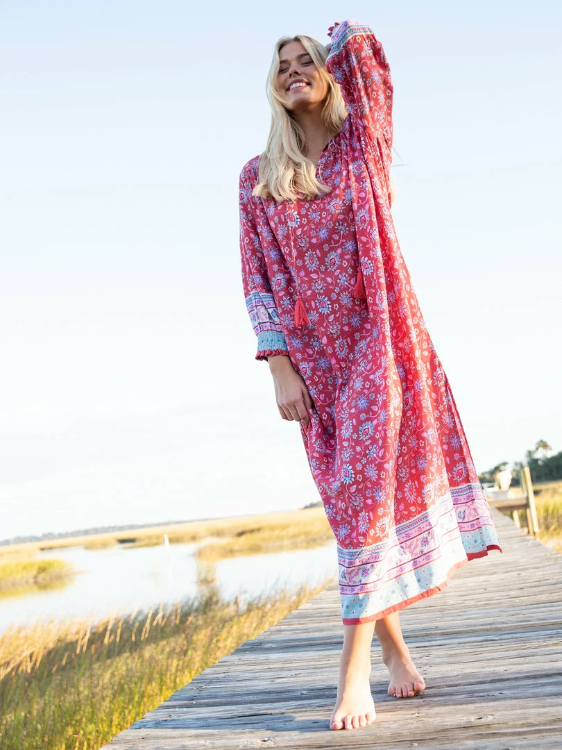 You loved the Dara Mini Dress so much, we had to make a Dara Maxi… and it’s so beautiful! It features a v-neckline with tassel ties, smocked sleeve openings & a pretty border print! It’s lightweight, making it so comfy and easy to wear – literally anywhere!