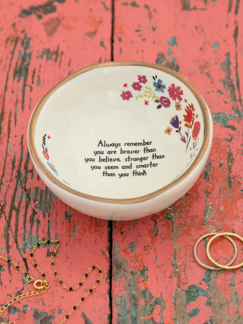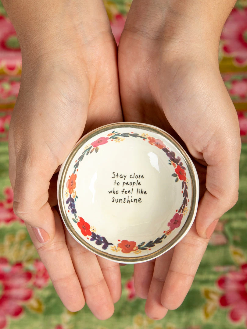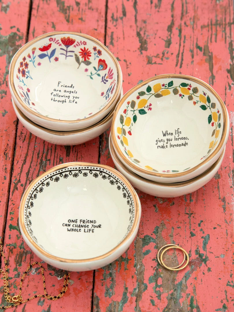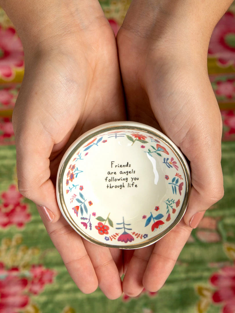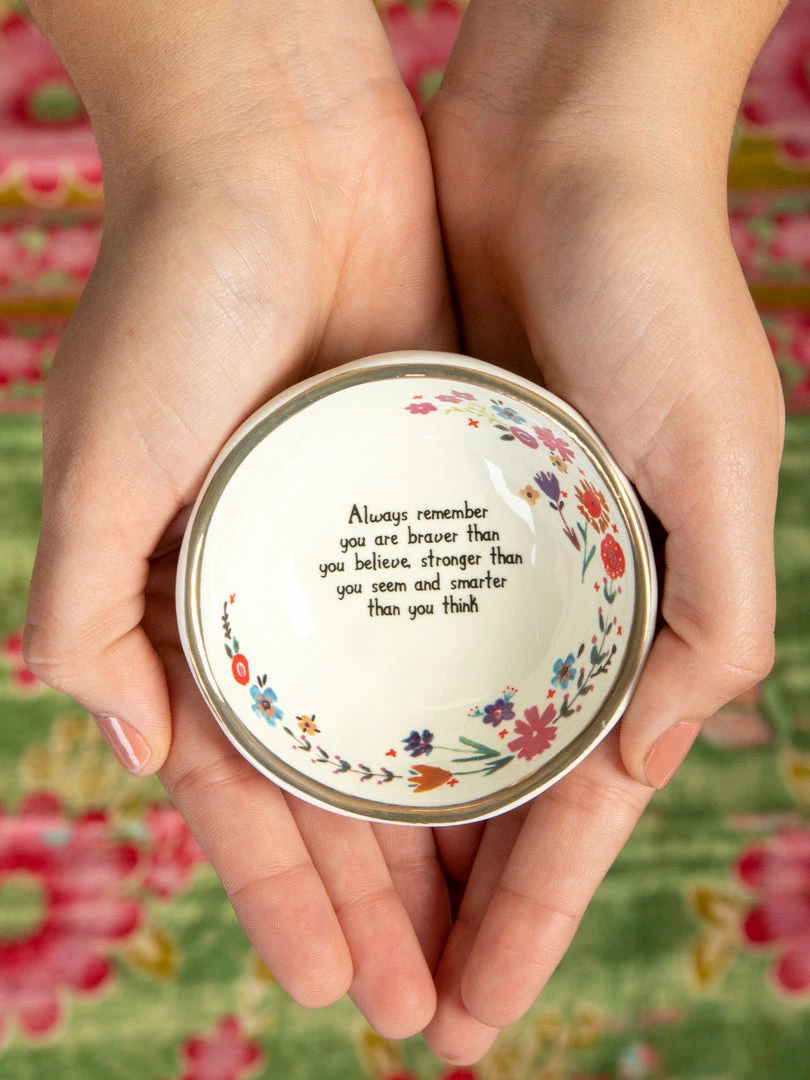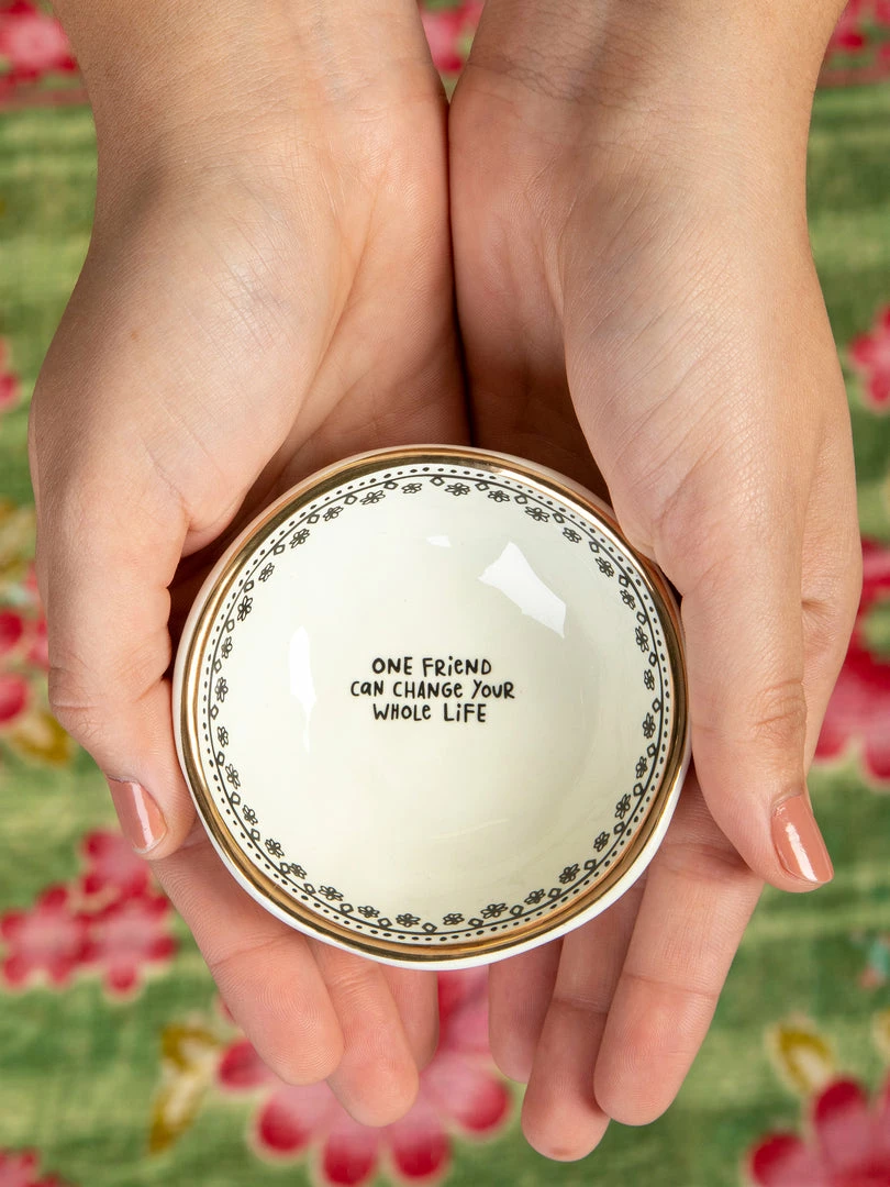 Thoughtful gifts are the best gifts. Our hand-molded Giving Trinket Bowl is the gift you can give to anyone! Every time they use it, they’ll be reminded that they are loved. You can even gift one to yourself to keep by your sink to hold your rings. Each bowl has a gold-rimmed edge and a sweet sentiment that will make anyone’s day. They’re the perfect size for bracelets, rings, or any tiny treasure. Keep one on your desk to hold paperclips, post-it-notes, or your earbuds. We love to give everyday items a home in something special that will make you smile. By holding your important things in our Giving Trinket Bowl, you’ll always remember where you left them!