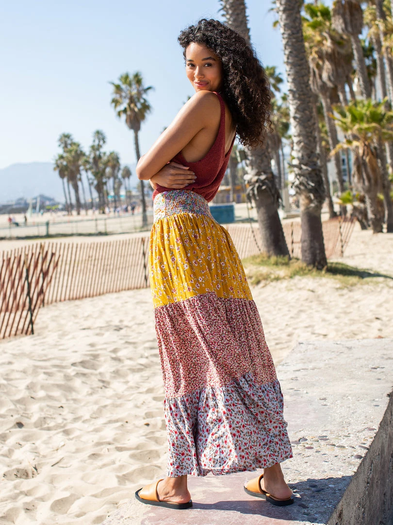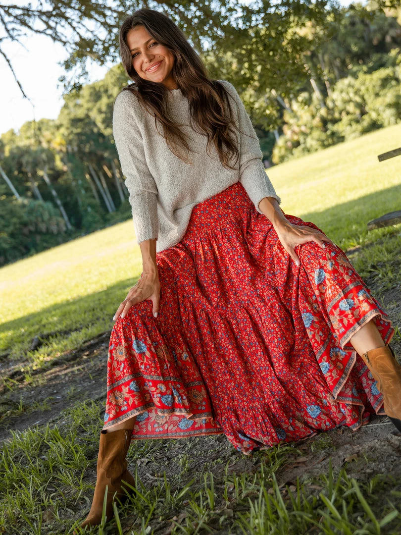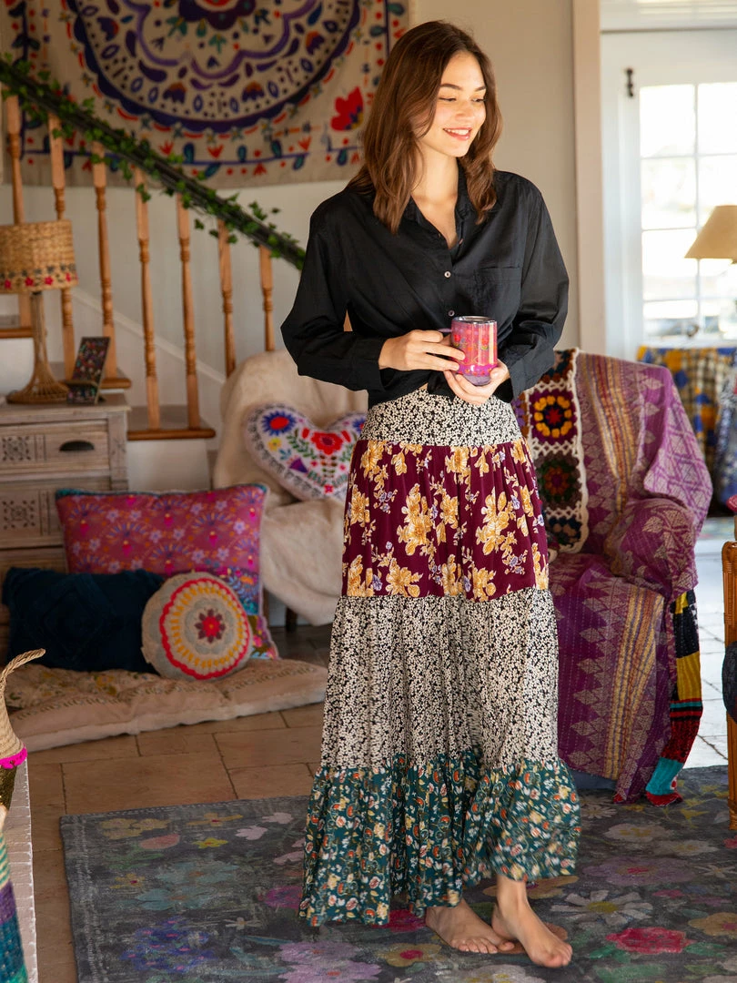 The Hanna Maxi Skirt is one of our most loved skirts! The bohemian mixed prints, billowy tiers and wide waistband with smocked elastic in the back makes it incredibly flattering and effortless. It’s such a pretty skirt that you can’t help but feel beautiful in it!
