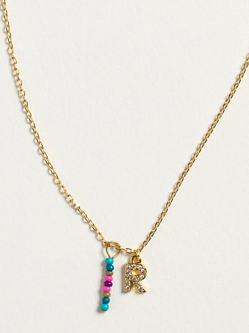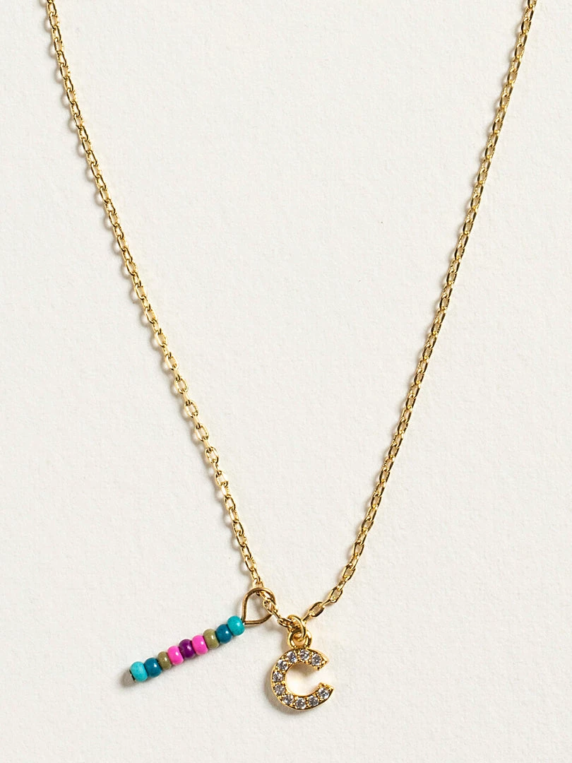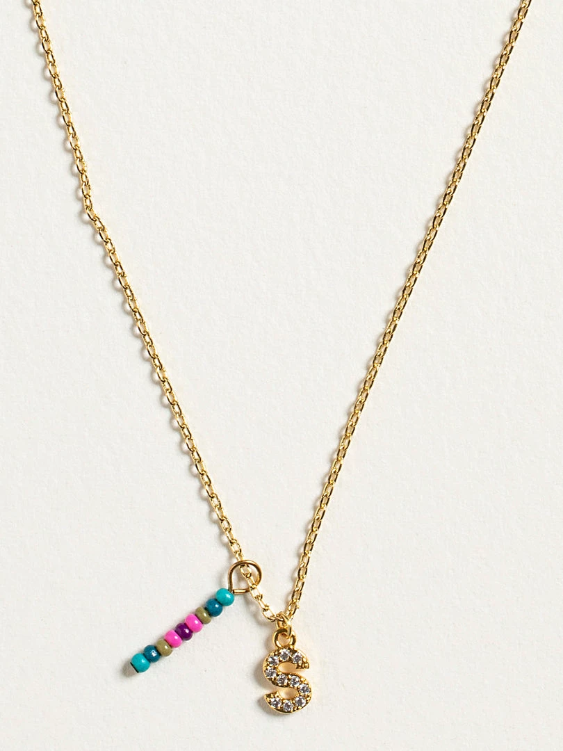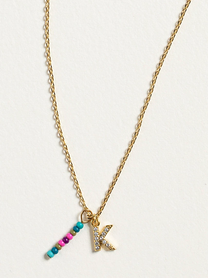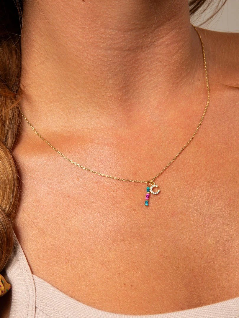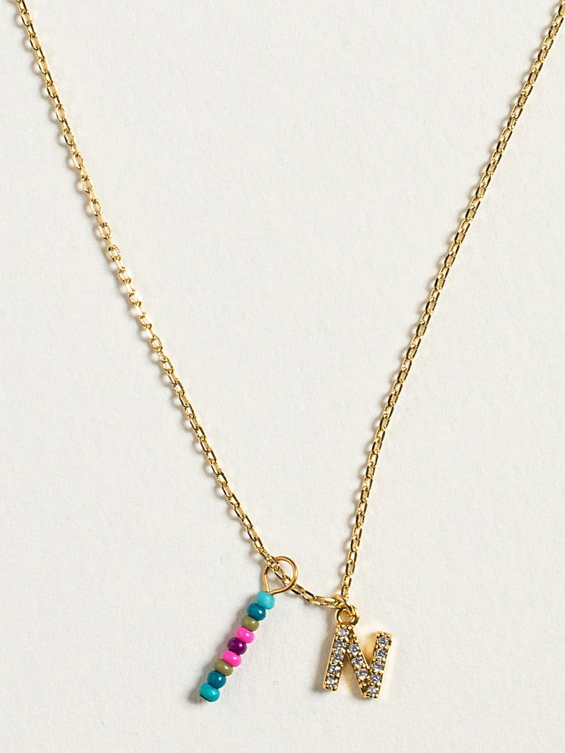 Personalized gifts are the best for giving! This necklace features a single gold-plated initial charm with tiny rhinestones and a colorful hand-beaded charm to add to its touch of personalization. It comes in the prettiest givable bag and can adjust up to 19 inches in length, making it great for wearing alone or with our other necklaces for a layered look!