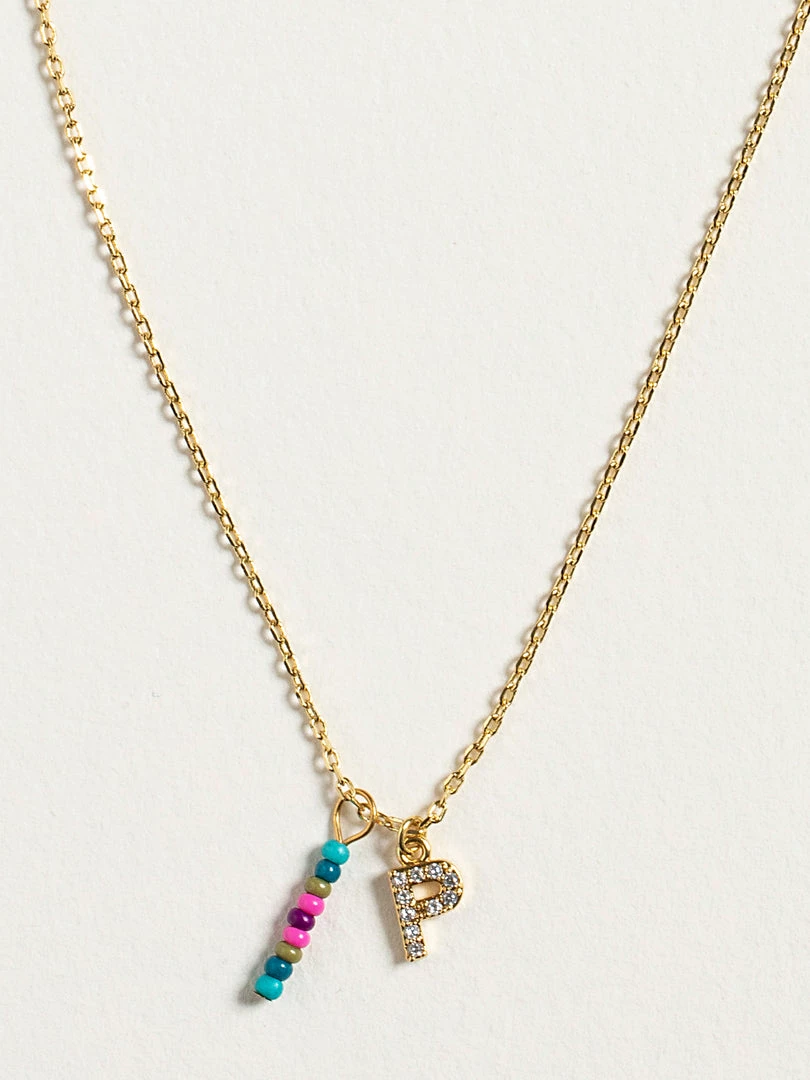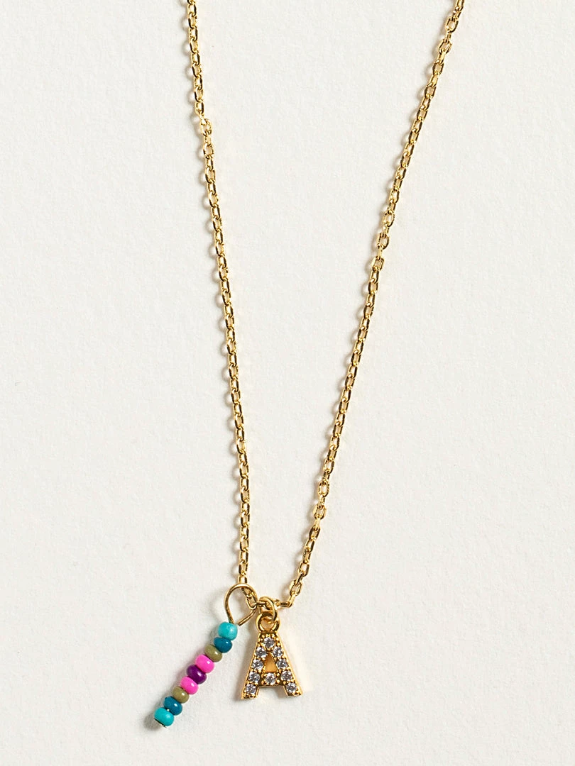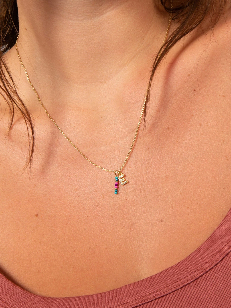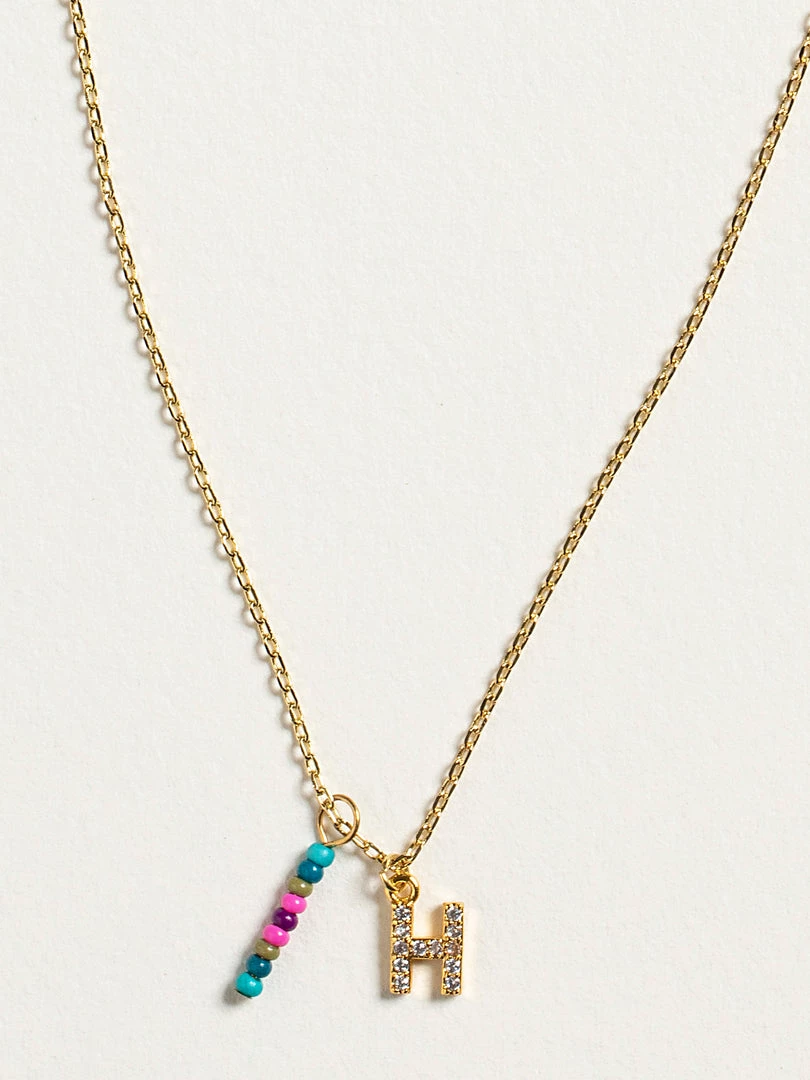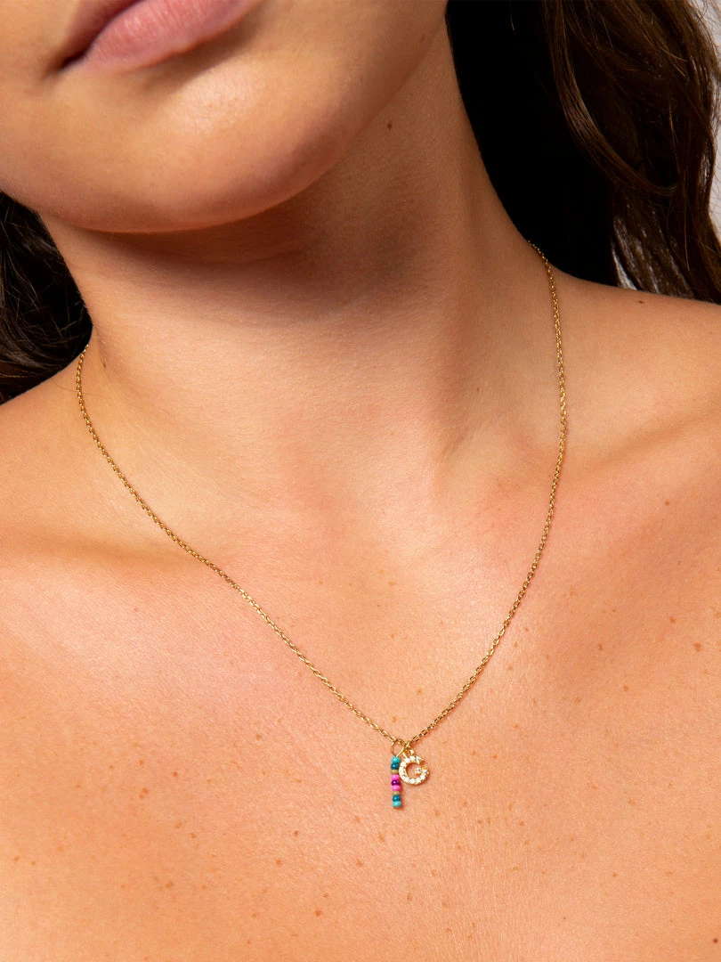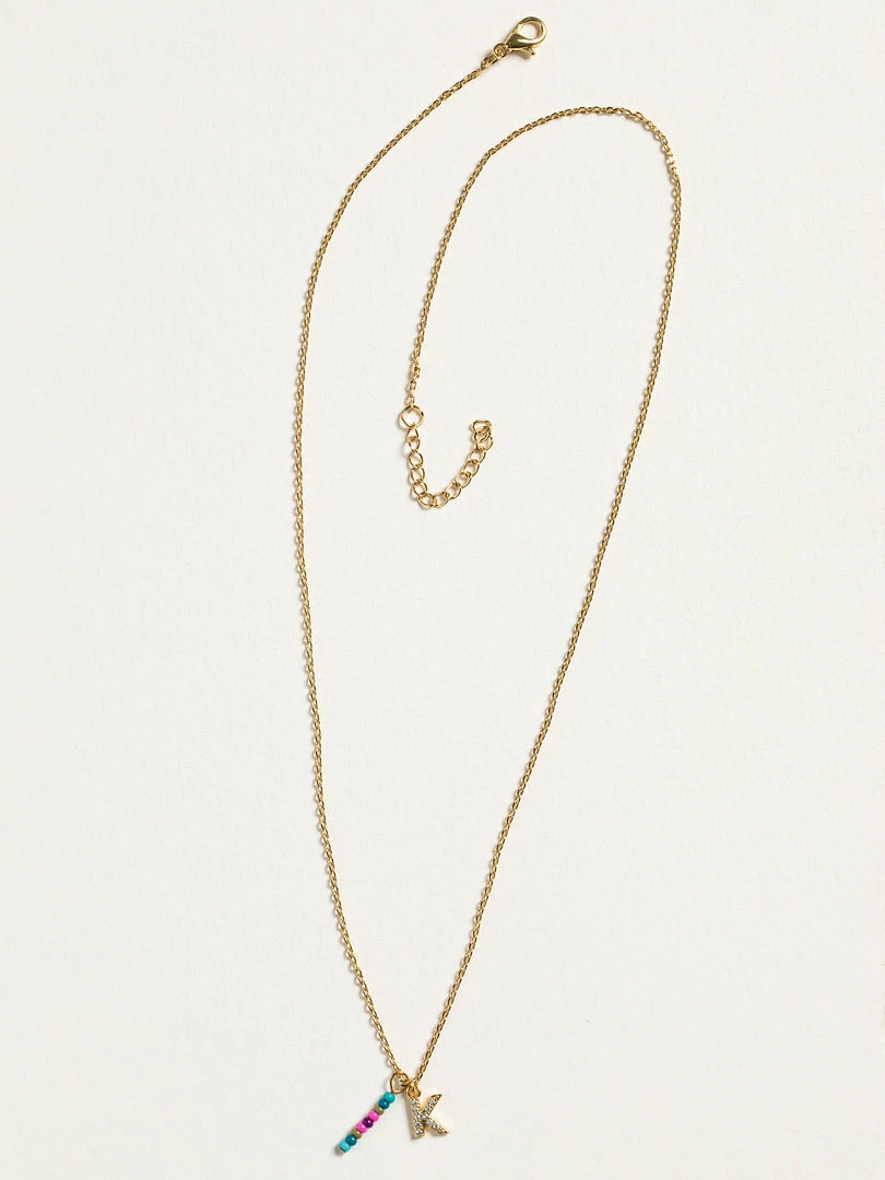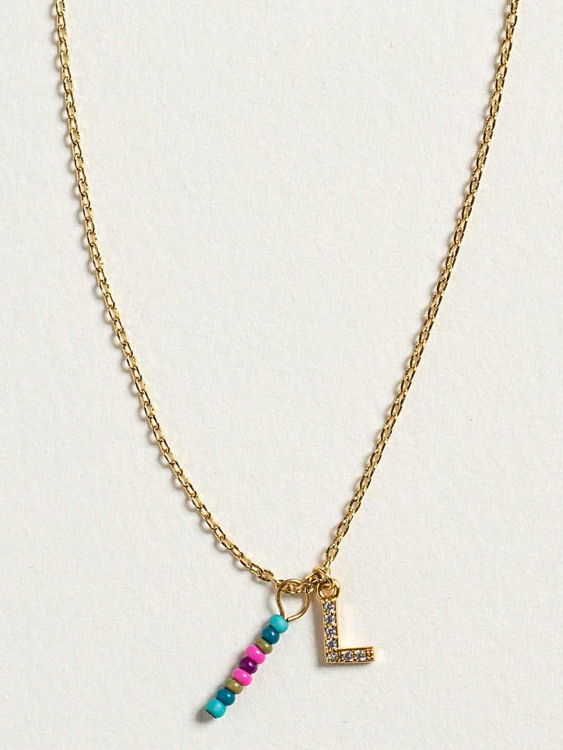 Personalized gifts are the best for giving! This necklace features a single gold-plated initial charm with tiny rhinestones and a colorful hand-beaded charm to add to its touch of personalization. It comes in the prettiest givable bag and can adjust up to 19 inches in length, making it great for wearing alone or with our other necklaces for a layered look!