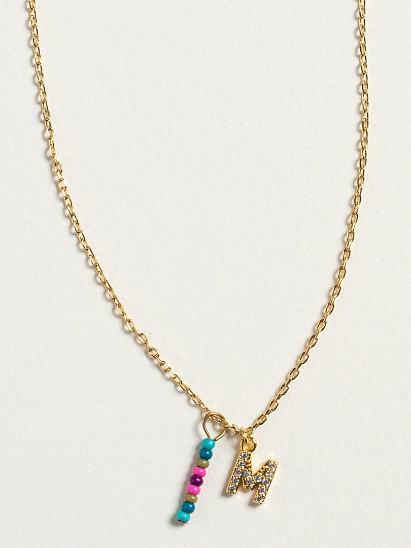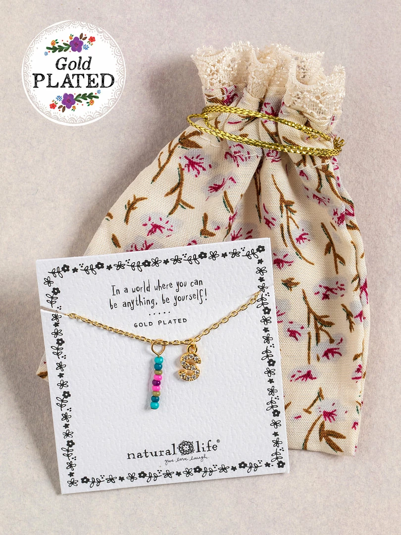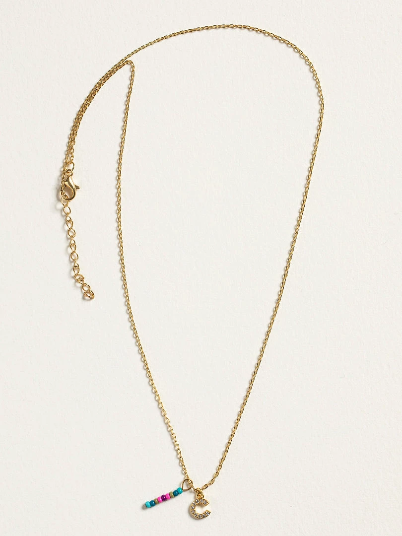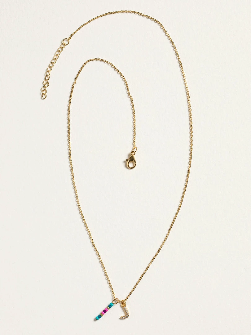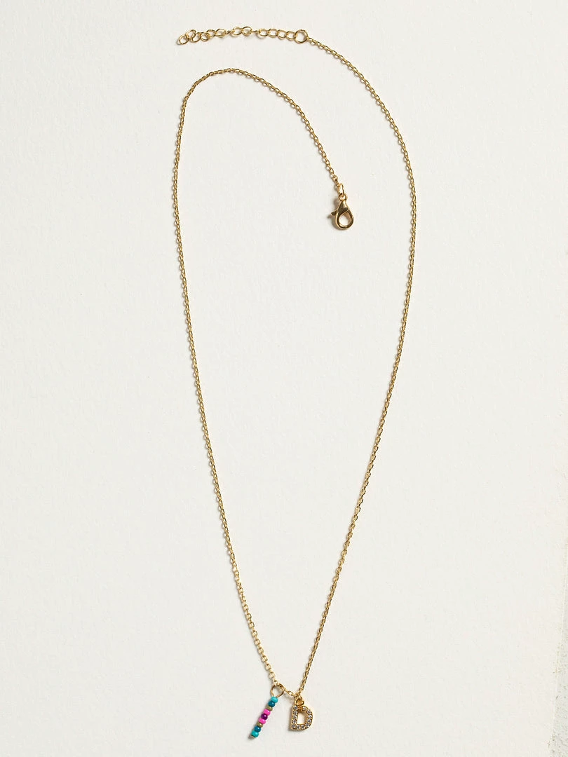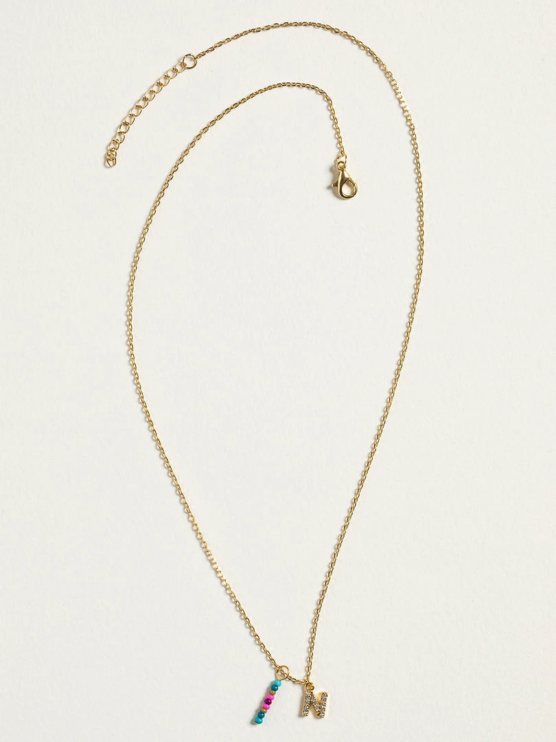 Personalized gifts are the best for giving! This necklace features a single gold-plated initial charm with tiny rhinestones and a colorful hand-beaded charm to add to its touch of personalization. It comes in the prettiest givable bag and can adjust up to 19 inches in length, making it great for wearing alone or with our other necklaces for a layered look!