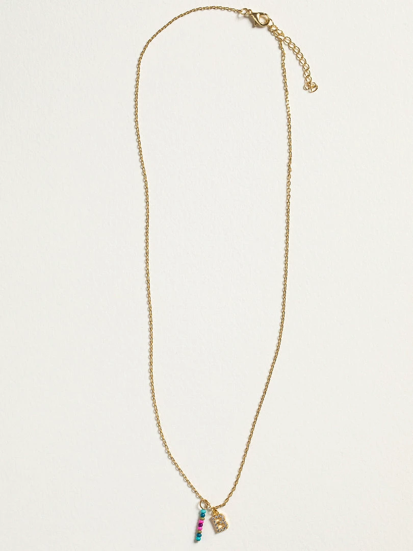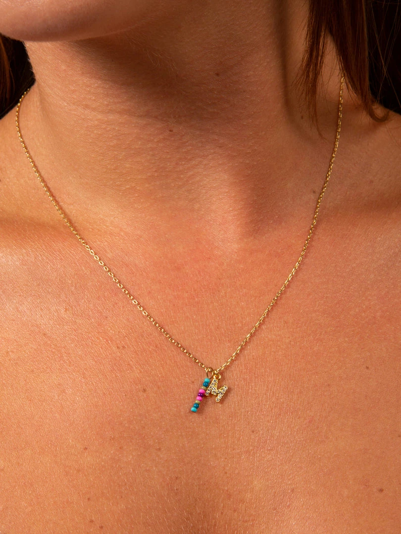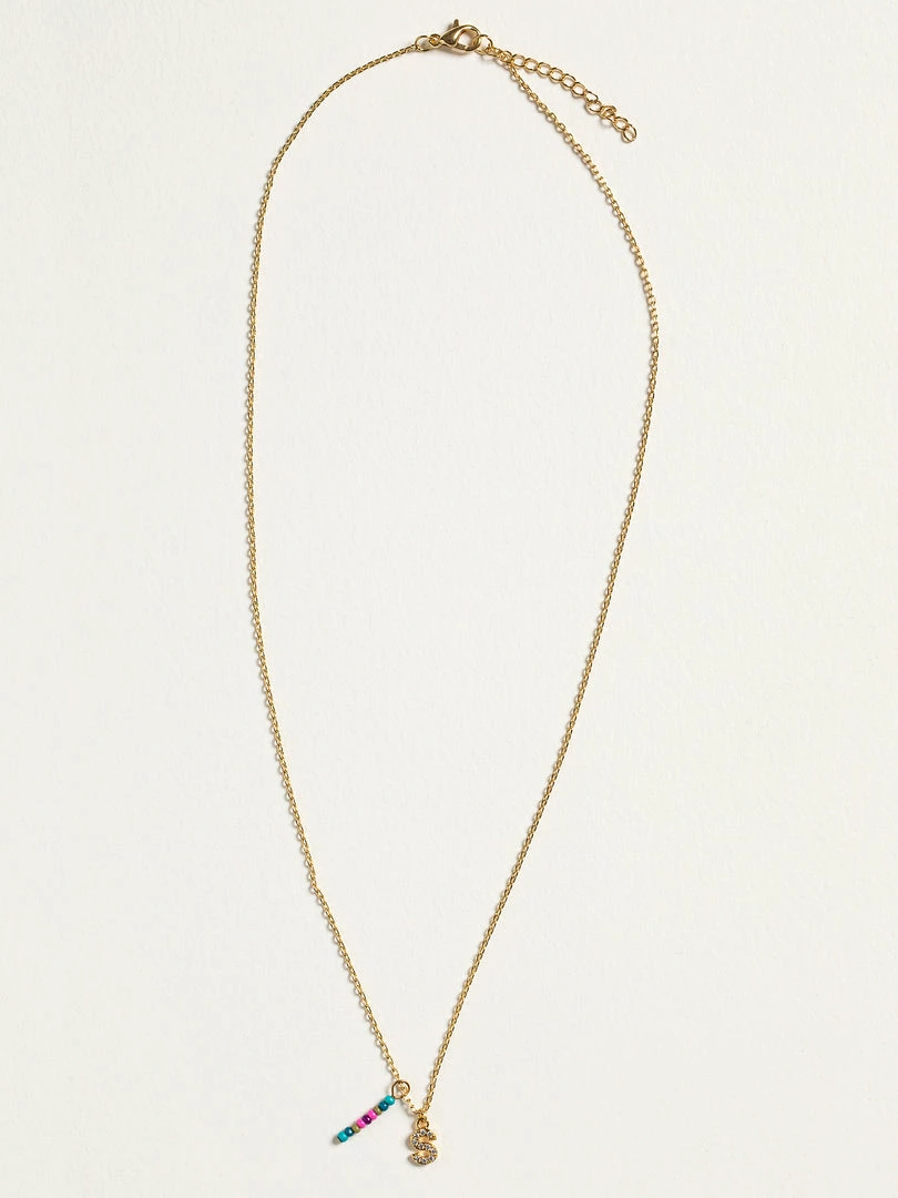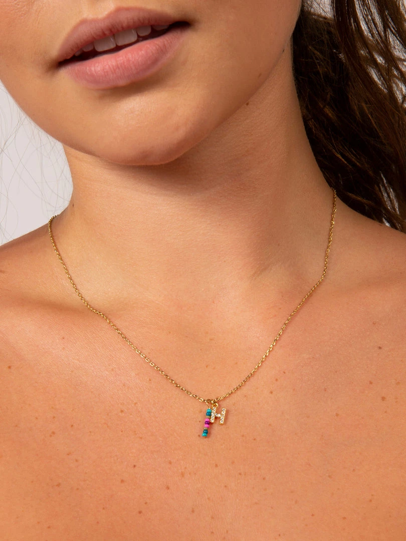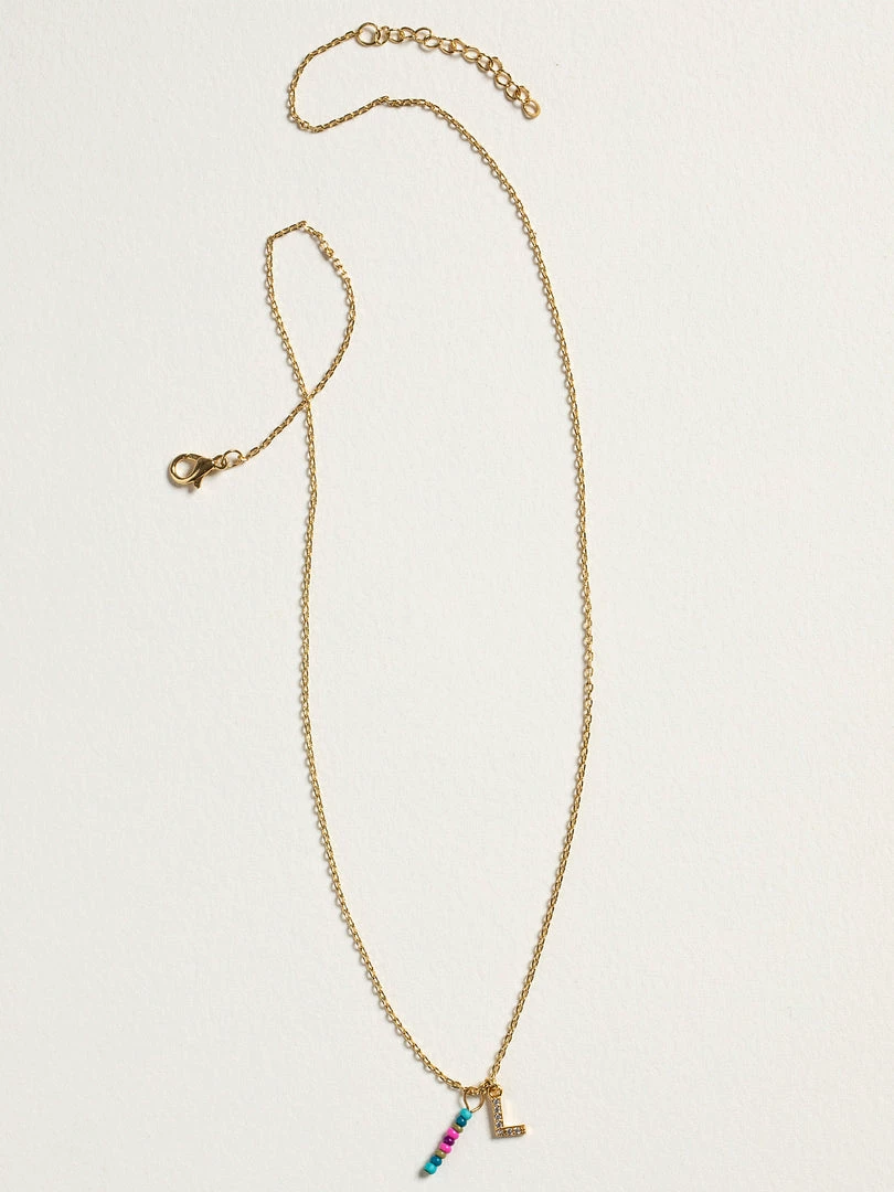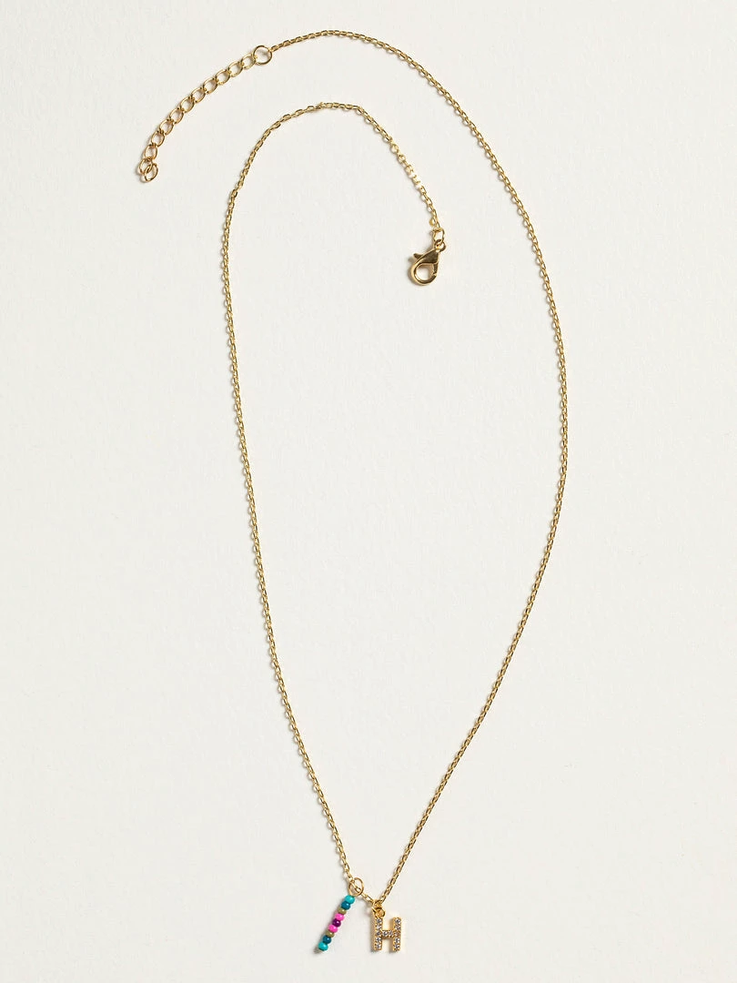 Personalized gifts are the best for giving! This necklace features a single gold-plated initial charm with tiny rhinestones and a colorful hand-beaded charm to add to its touch of personalization. It comes in the prettiest givable bag and can adjust up to 19 inches in length, making it great for wearing alone or with our other necklaces for a layered look!