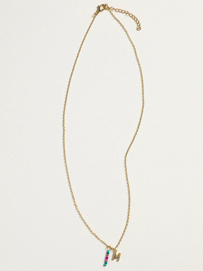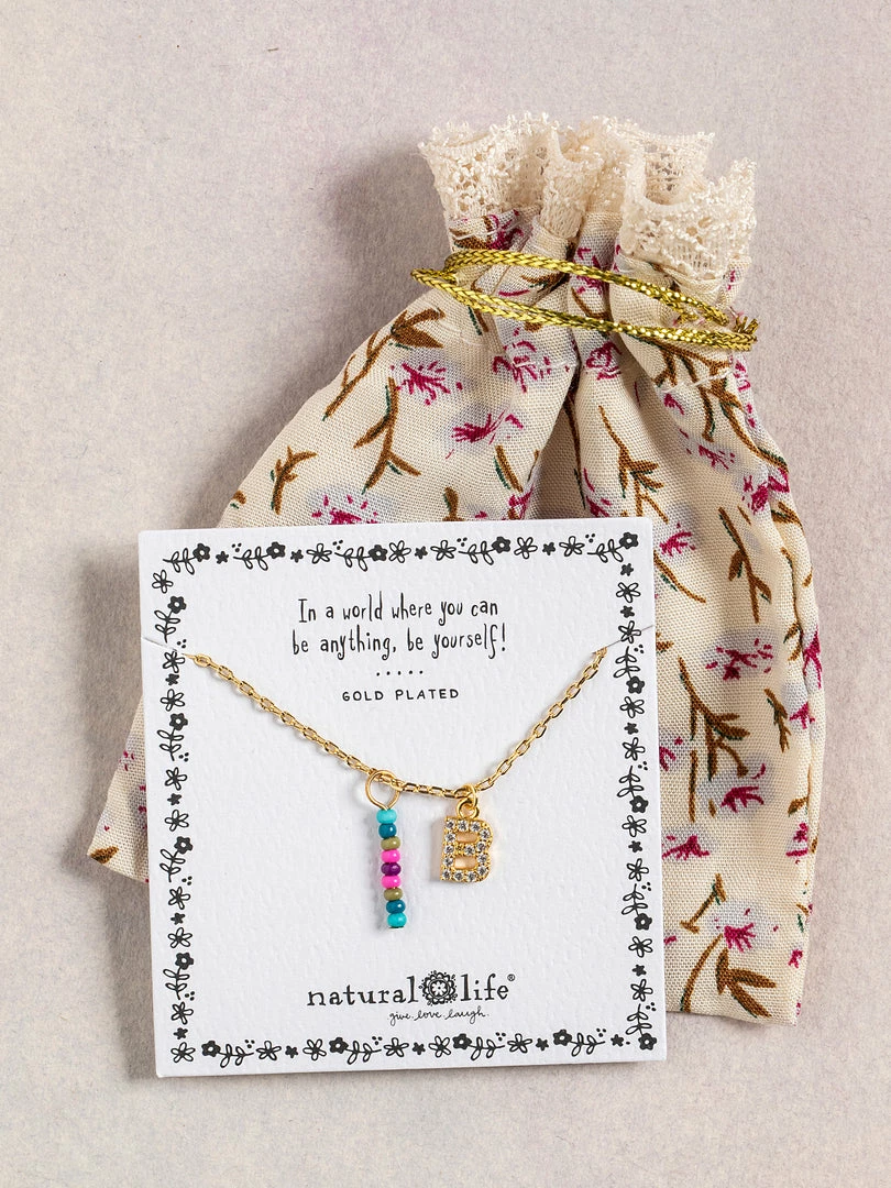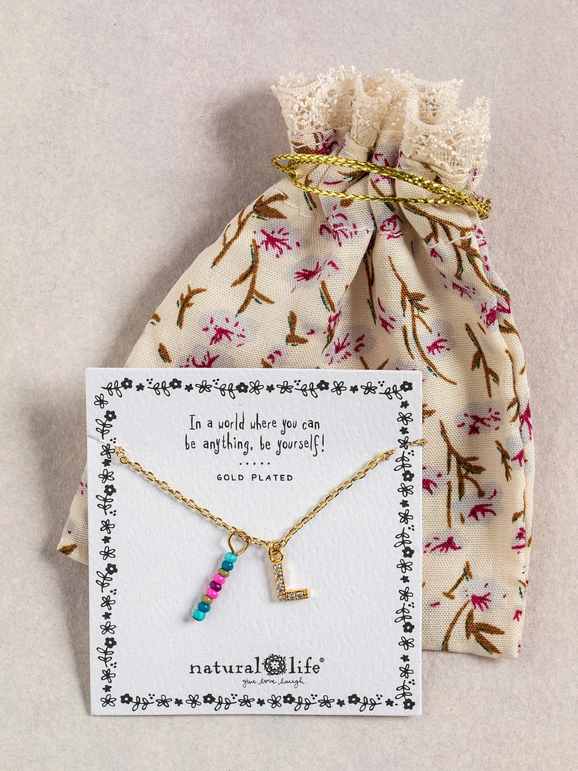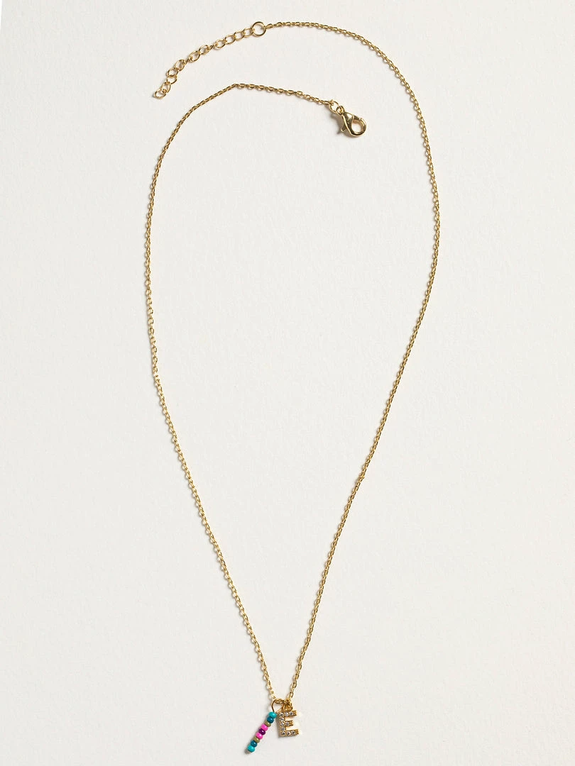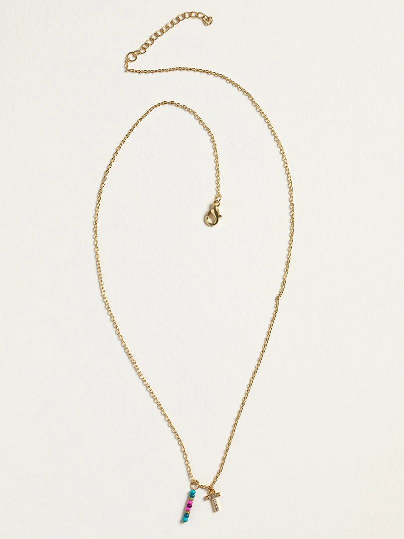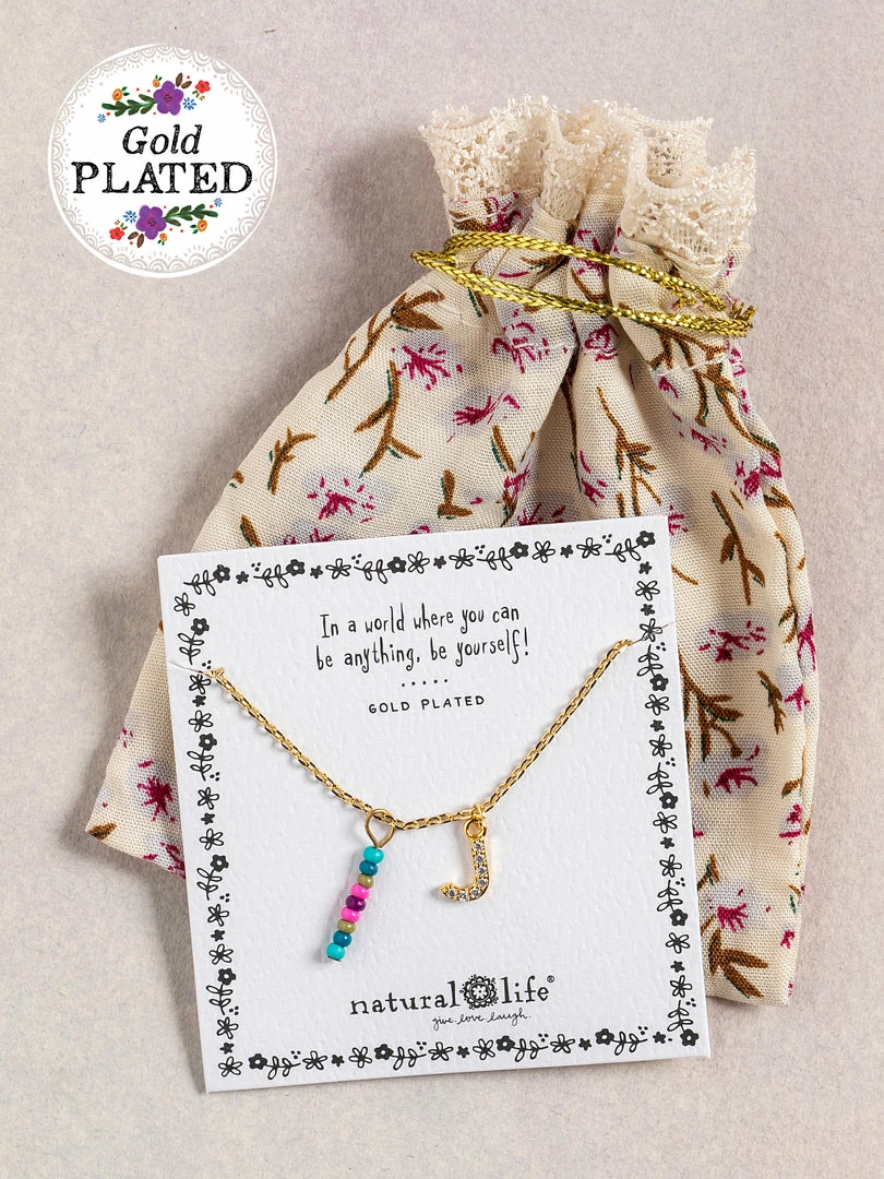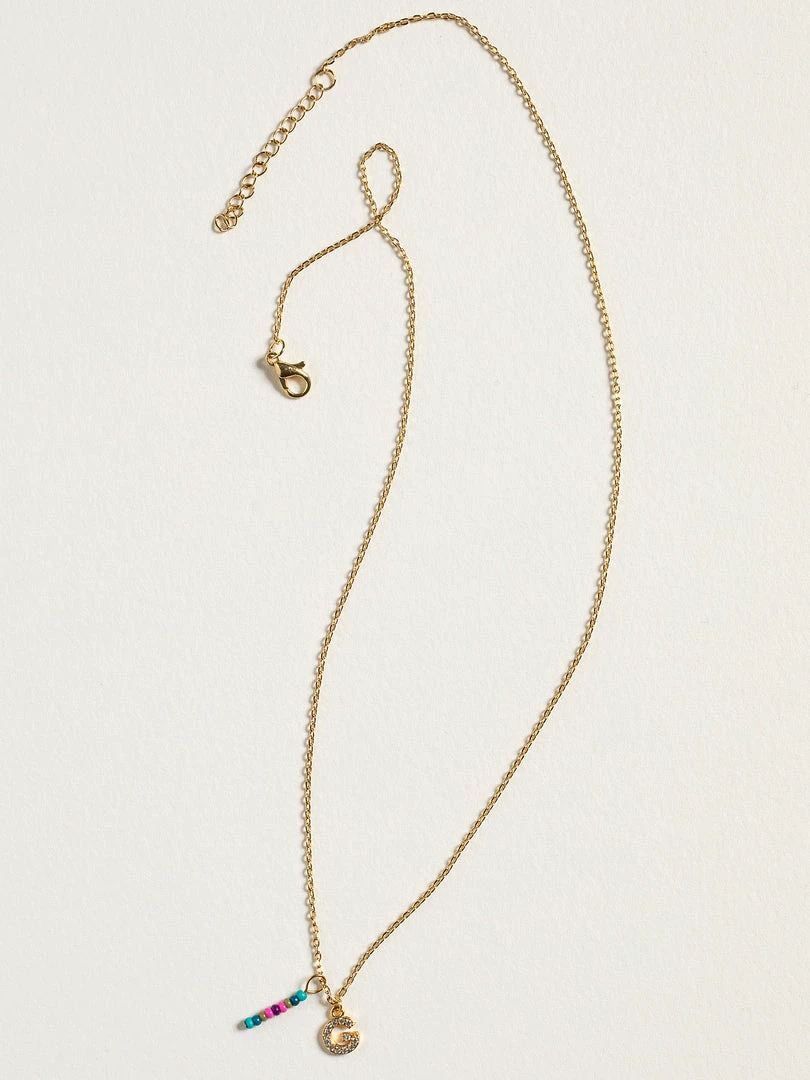 Personalized gifts are the best for giving! This necklace features a single gold-plated initial charm with tiny rhinestones and a colorful hand-beaded charm to add to its touch of personalization. It comes in the prettiest givable bag and can adjust up to 19 inches in length, making it great for wearing alone or with our other necklaces for a layered look!