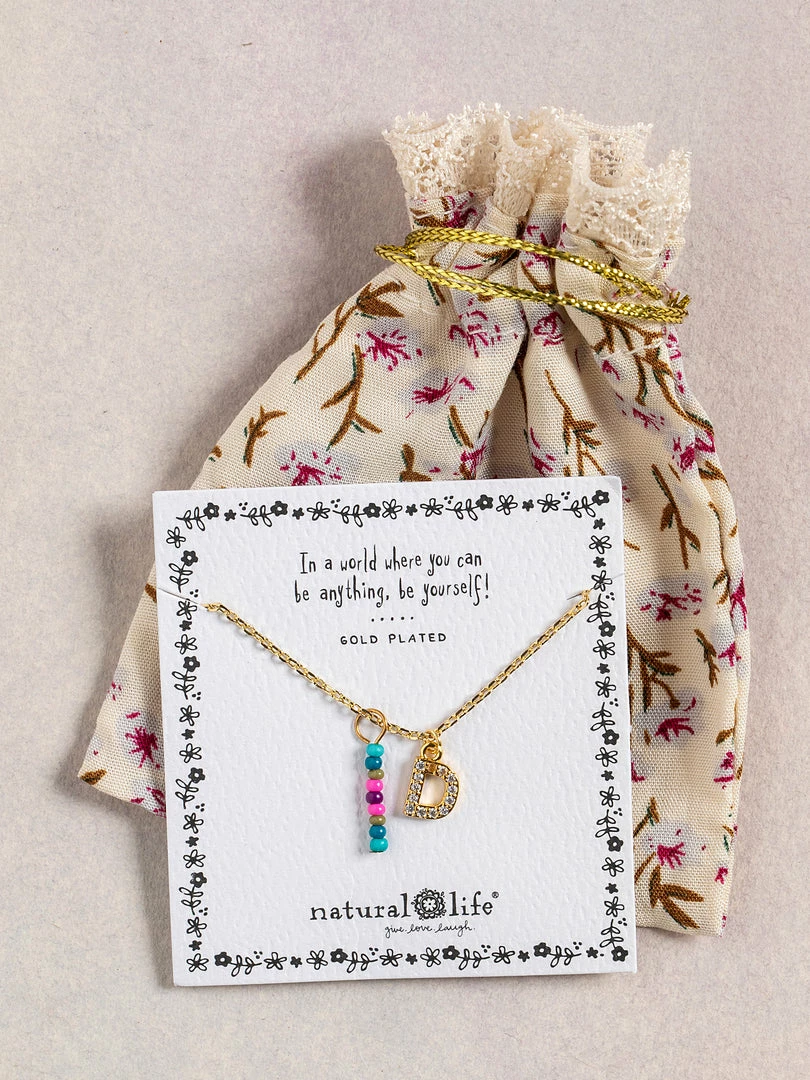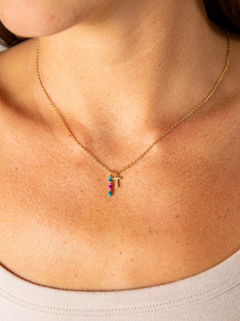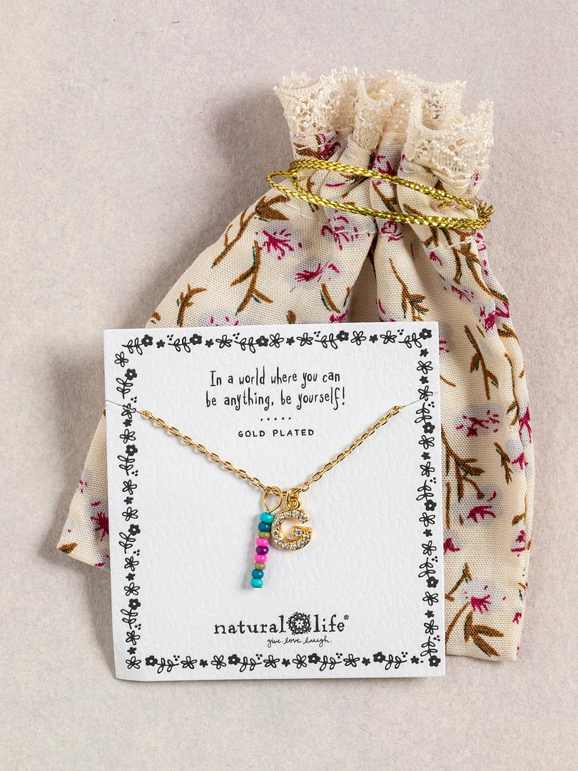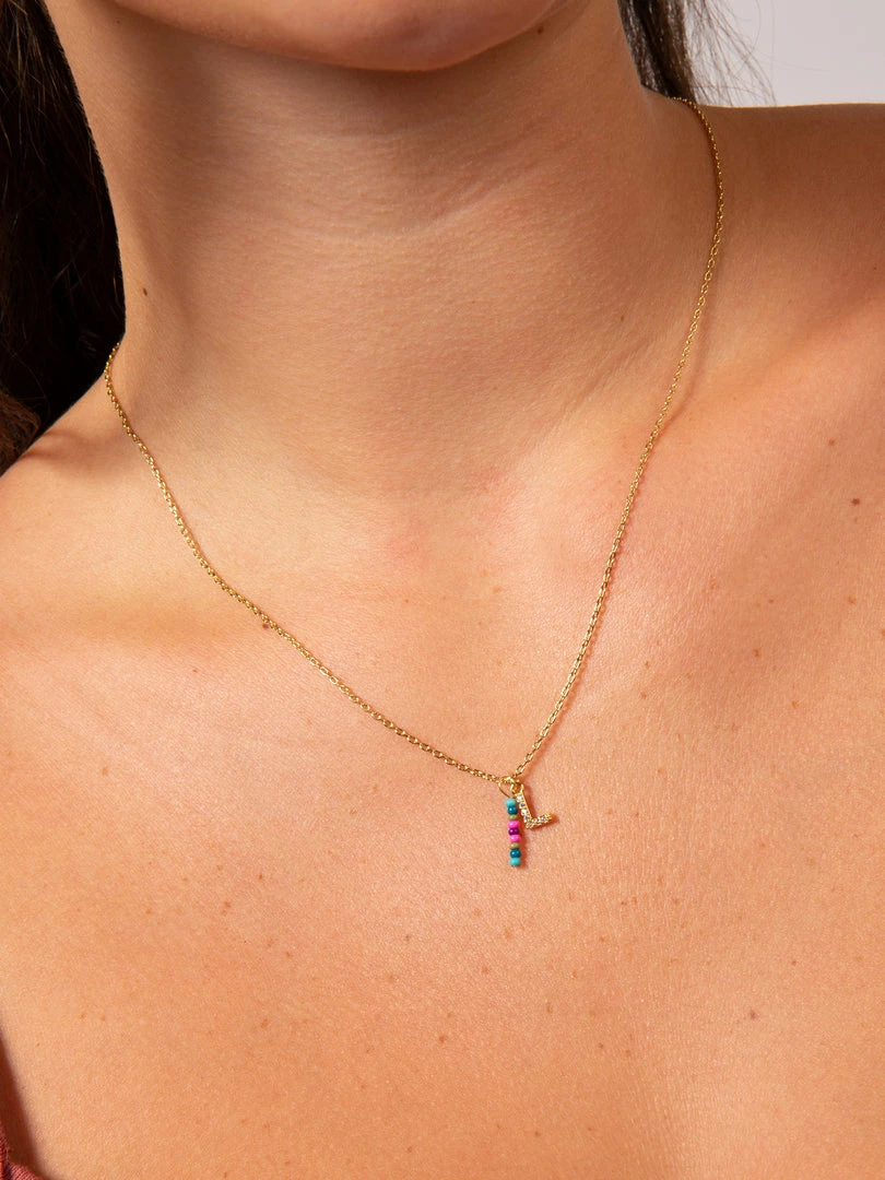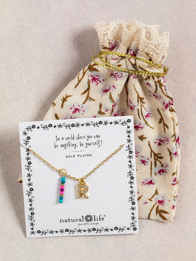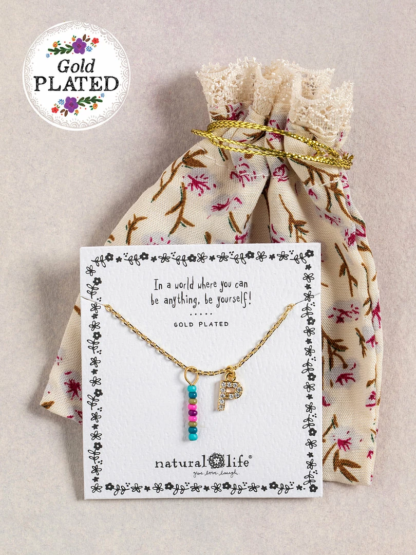 Personalized gifts are the best for giving! This necklace features a single gold-plated initial charm with tiny rhinestones and a colorful hand-beaded charm to add to its touch of personalization. It comes in the prettiest givable bag and can adjust up to 19 inches in length, making it great for wearing alone or with our other necklaces for a layered look!