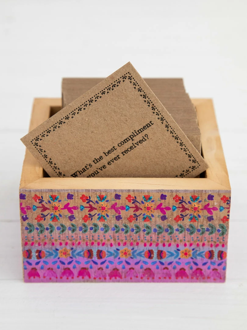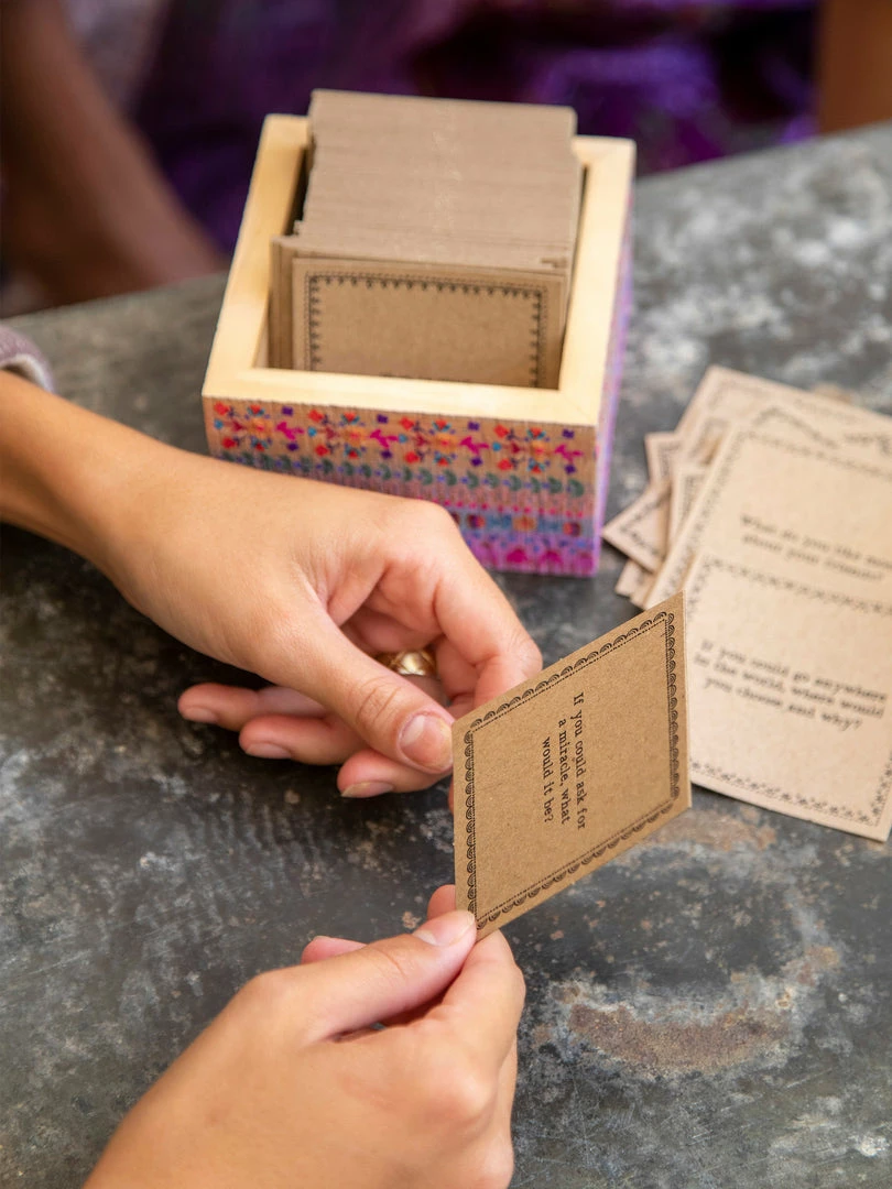 We love to make things that inspire people to live happy! This Little Box Of Questions is the perfect ice breaker and is so fun for holiday gatherings, parties, family dinners… or just because! Each card comes printed with a question to inspire conversation and good memories! Oh, and they come in the cutest box to display on your coffee table, dining room or to give as a hostess gift!
