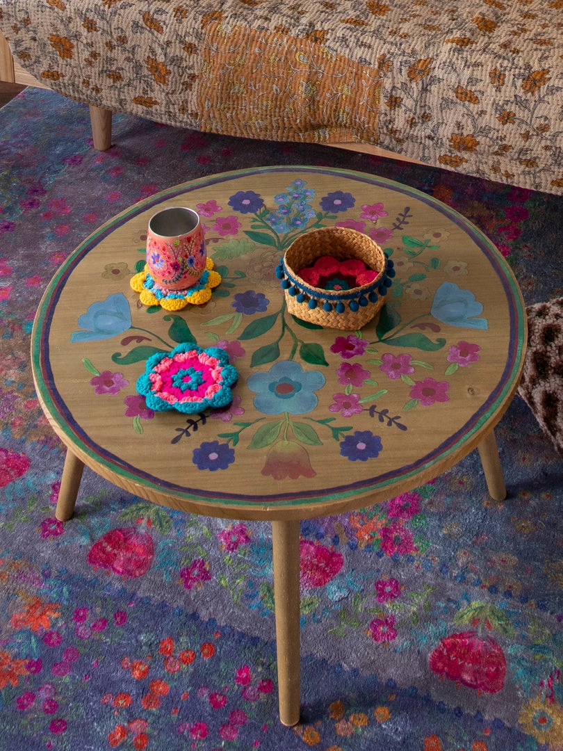 This Little Wooden Table is so adorable and we purposely made it low to go with our Peruvian Poufs! It features a pretty floral design on the top and looks so cute in your living room, bedroom or patio and makes a great little coffee table! We love using big comfy pillows to sit on around it with our family & friends to snack, work or play cards… it makes the perfect conversation table!