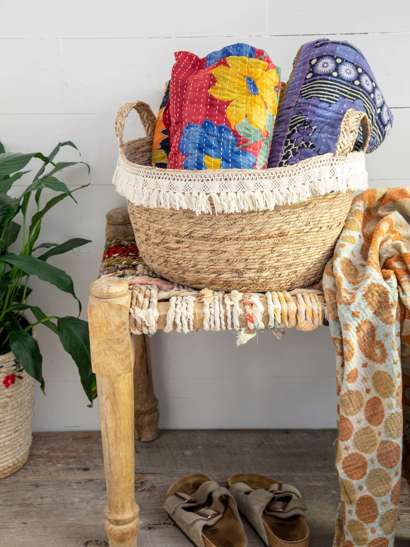 We love cute & functional baskets… like the Macrame Fringe Basket! The large one is perfect for towels, throw blankets and rolled scarves and the small one is an awesome kitchen counter or coffee table basket for fruit, remotes and books!