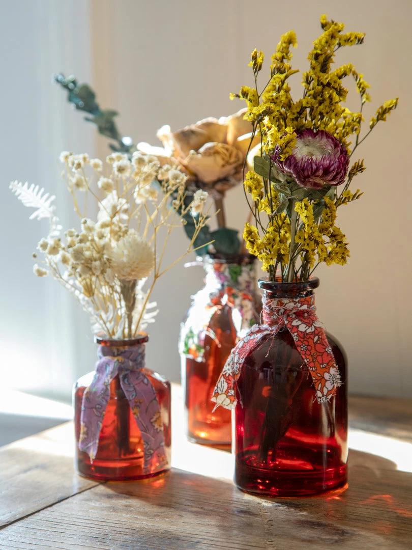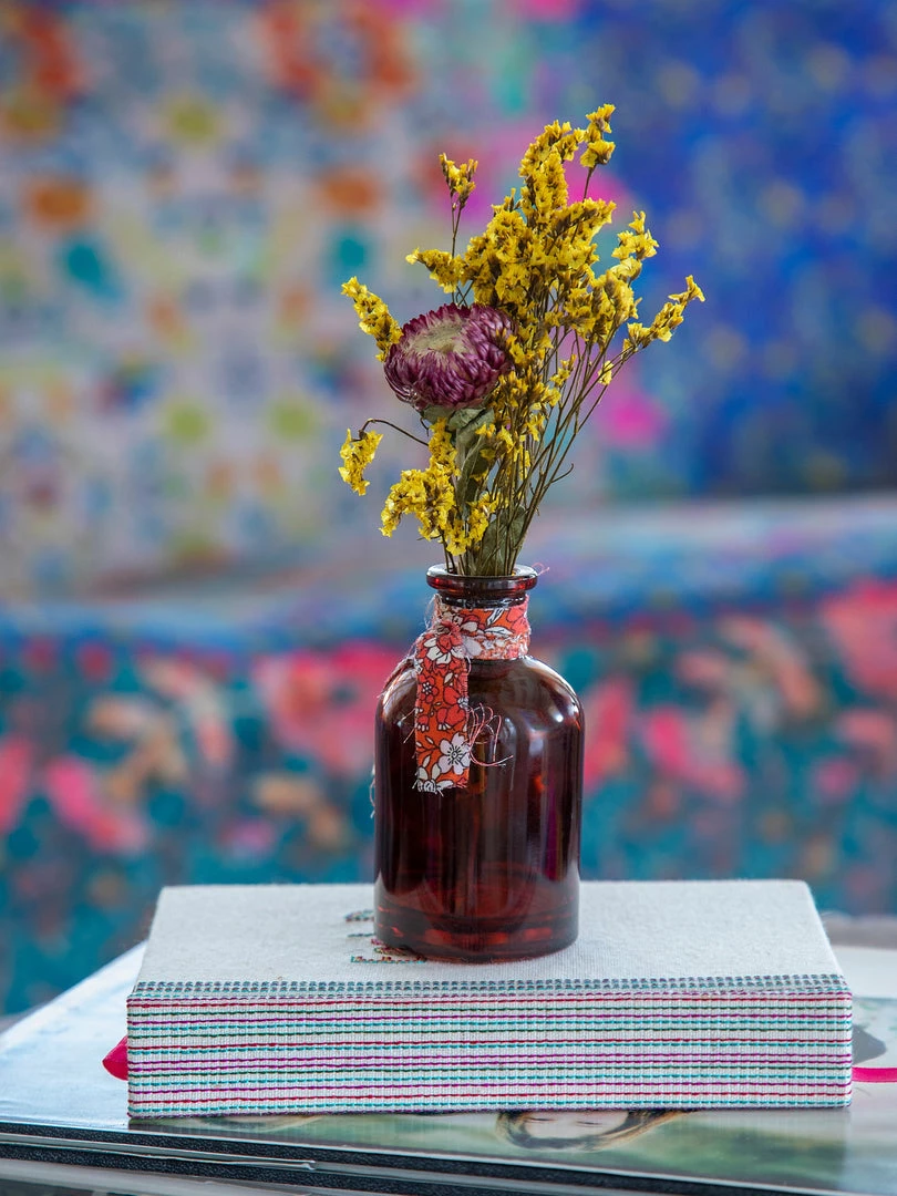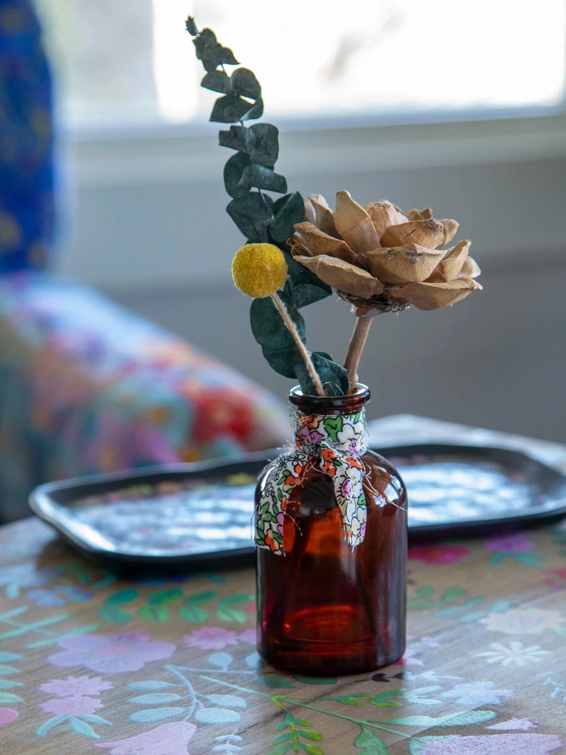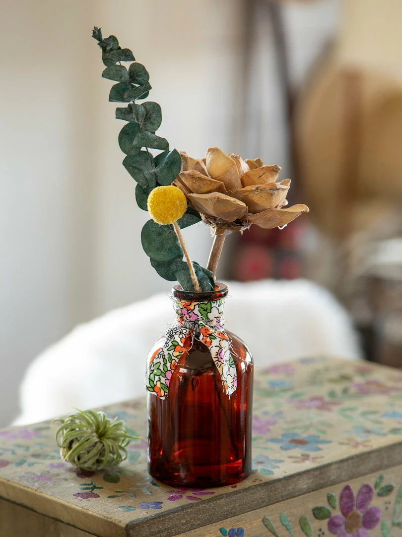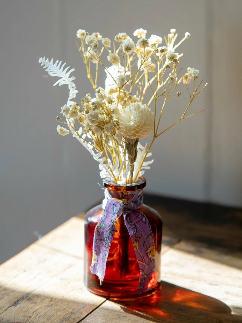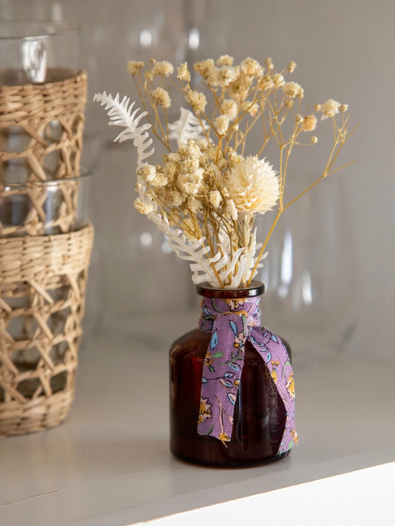 We love placing these little bottles of dried flowers tucked around our living space in any nook, nightstand or shelf. Each little arrangement is made from real preserved flowers placed in an amber glass bottle and tied with a cute raw edge printed fabric. They’re sold individually, but look so cute in clusters or in different rooms… so we always get at least one of each! They also make a sweet little gift for someone you love!