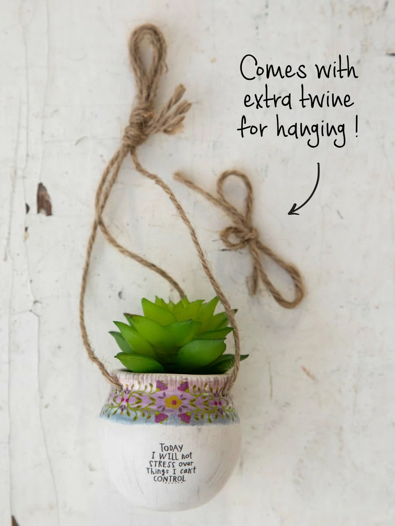 Hang a little happy in any tiny spot! This Hanging Faux Succulent is perfect to hang under a shelf, on your wall, in your kitchen window or even in your car! We added an extra piece of twine for easy hanging!