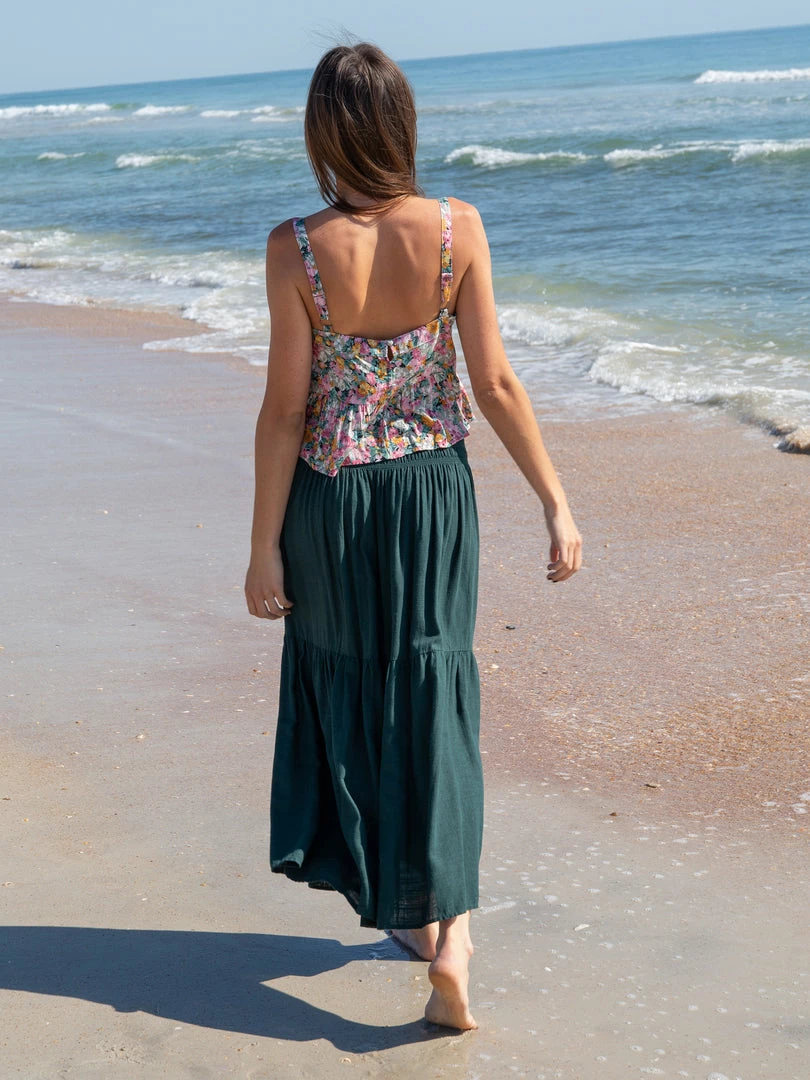The Angelina Midi Skirt is one of our favorites! This easy pull-on features a smocked waistband, a tier and front slit over the left leg. It’s so flowy & fun to wear, especially with one of our cute tops!