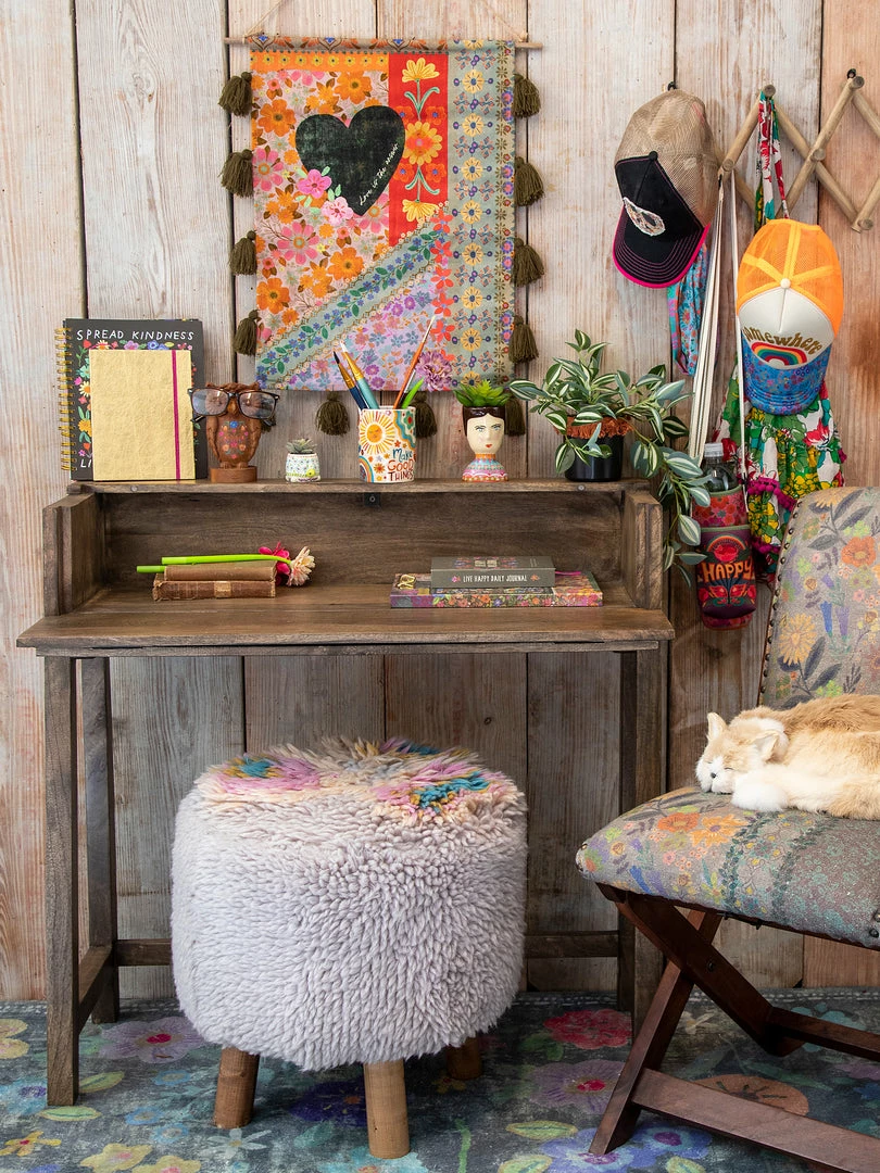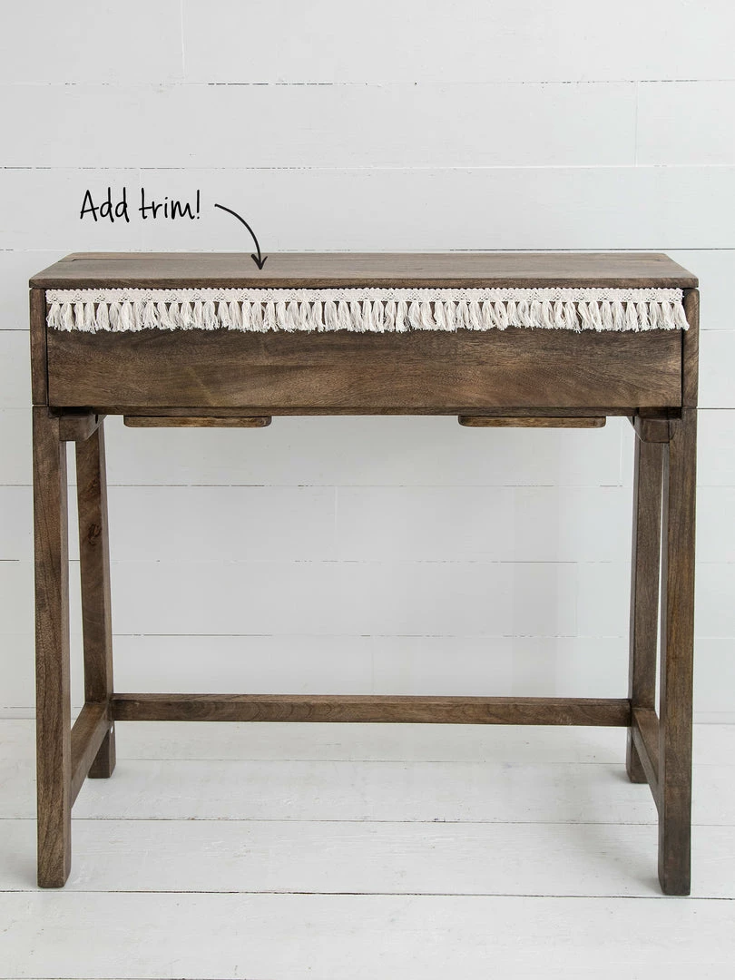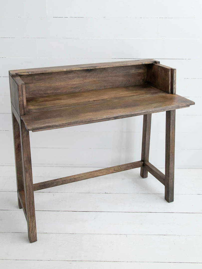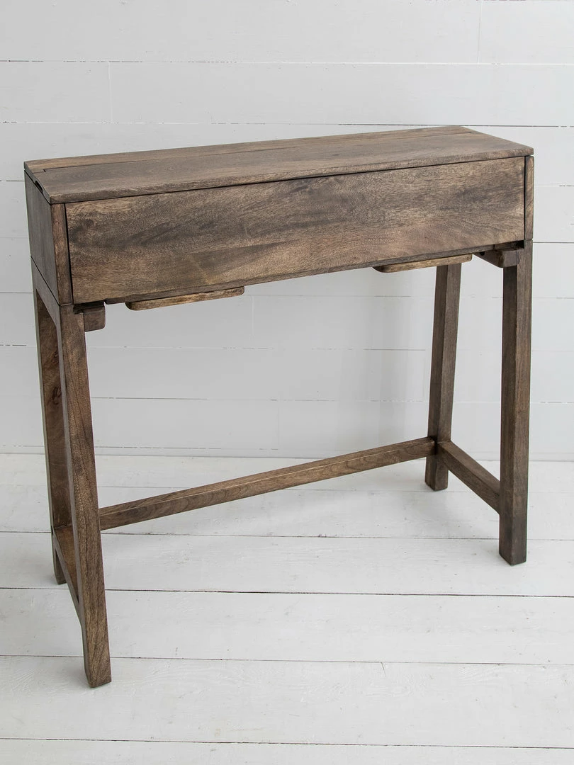 The Bungalow Writing Desk & Console folds open to a sturdy top for writing and working! When the desk isn’t needed, just tuck it away so everything is hidden and looks super organized. It’s perfect for a small apartment, living room, bedroom or entryway… it will bring a modern and rustic touch to your space! It has a stained mango finish and there will be slight variations in wood color and grain. Each piece is uniquely one of a kind! Assembly is required and instructions are included.