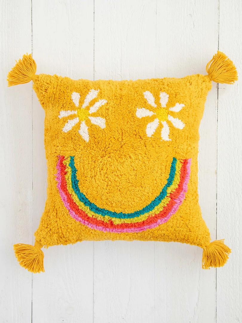 Bring happy vibes to your space with this hand Tufted Pillow featuring a sweet, smiley face! The backside is cotton with a zipper closure and it features fun little tassels on all four corners. It looks so cute thrown on a chair, couch or bed by itself or you can mix and match it with our other boho pillows for a little extra flare!