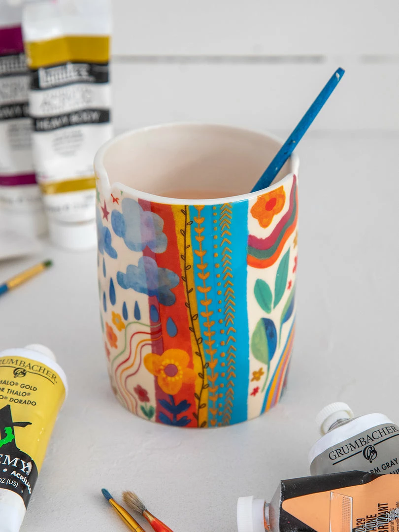 For the professional artist or the artist-at-heart, our Painter’s Cup will inspire you to live and create happy! It’s artfully adorned with one of our most-loved Chirps in bright boho color. We love to be creative, so we design products that help us to create beautiful things! Our Painter’s Cup even has notches to hold your paintbrushes. Get one to keep with your art supplies and buy a second for your bathroom vanity as a perfect home for your makeup brushes! Everyone needs to feed their creative soul.