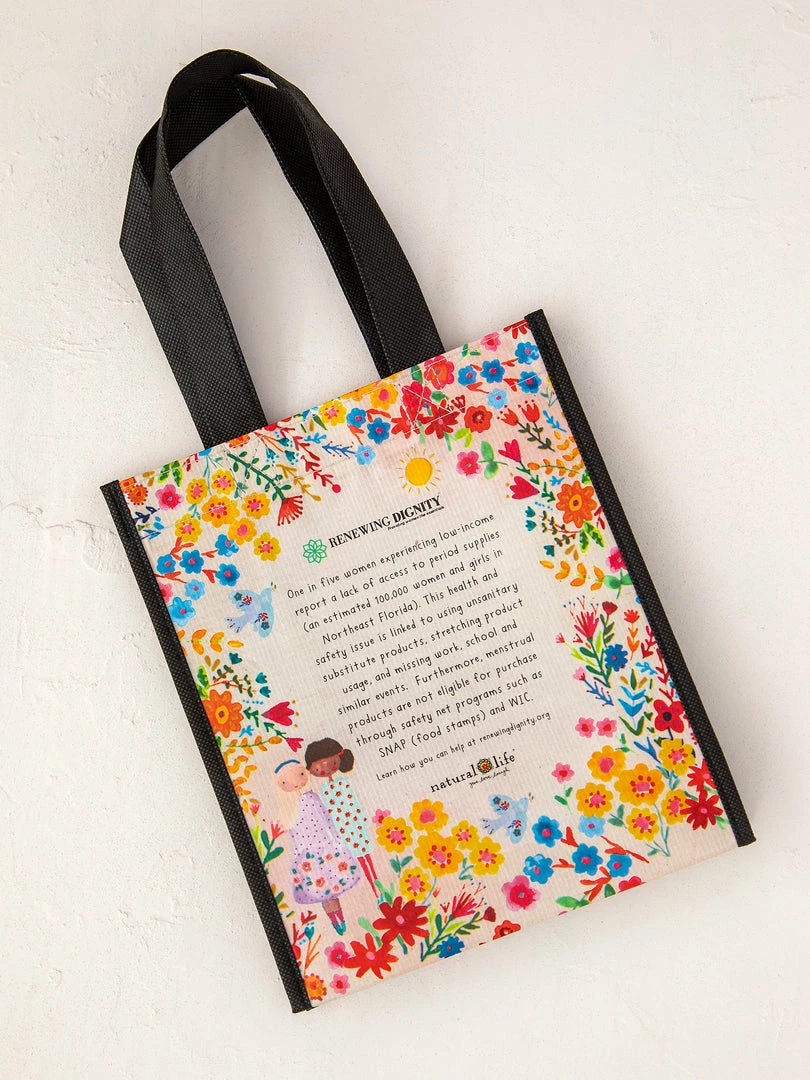 Our friend, Jan Healy, founded an organization called Renewing Dignity, whose mission is to eliminate “period poverty” through menstrual product distribution, education and advocacy. When we heard Jan’s idea, we couldn’t wait to help her! Patti, Natural Life Founder and CEO, joined the Renewing Dignity Board of Directors and started brainstorming ways to help this amazing organization! After putting our heads together, we decided to make the cutest Period Pouches and this Happy Bag to carry period supplies in. This Happy Bag is made with recycled water bottles and never get dog-eared so you really can use it forever! It features a sweet sentiment on the front, facts about Renewing Dignity and period poverty on the back & an incredibly informative list of period myths written by board member Dr. Marta Perez-Chomat on the sides of the bag. It’s the kind of information that every woman wishes they had as a young woman. The best part is that 10% of the proceeds from these products are donated to Renewing Dignity to help their mission!