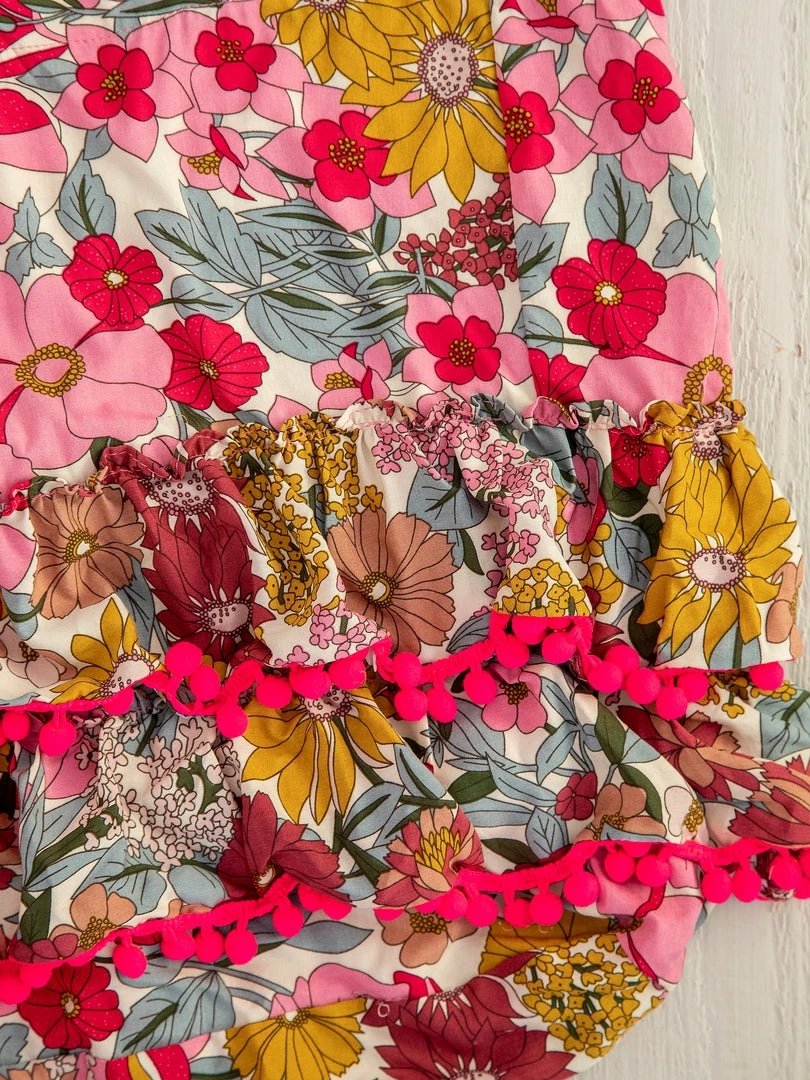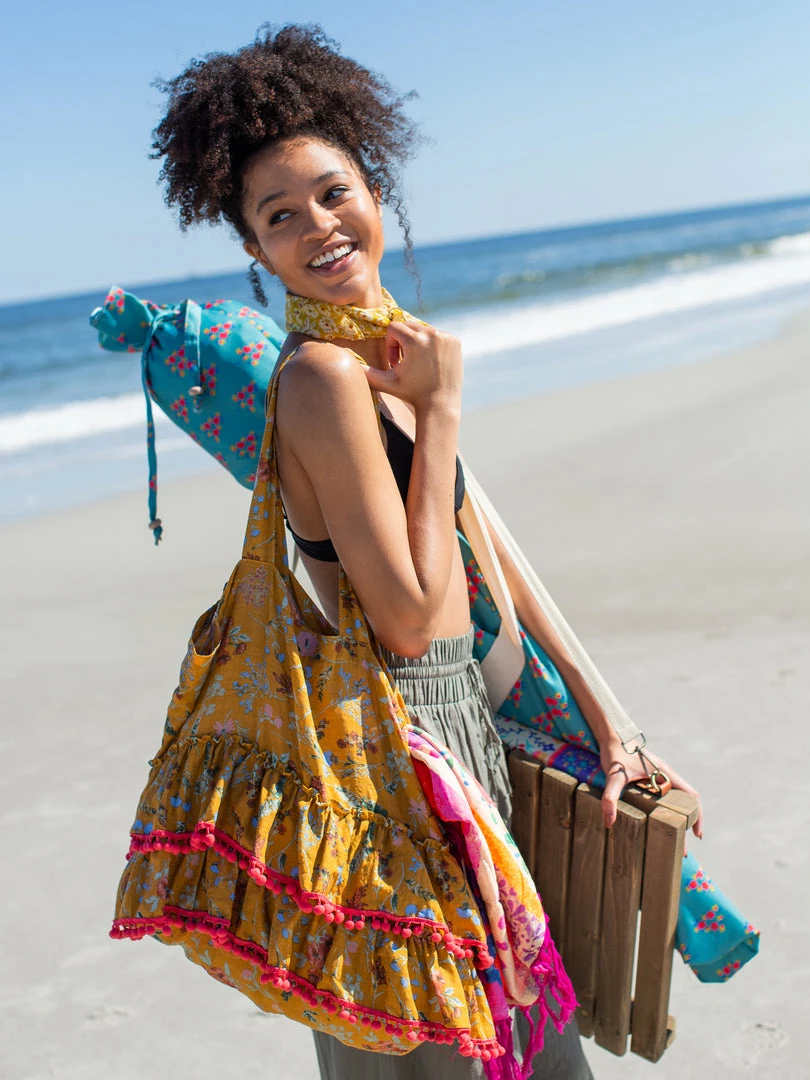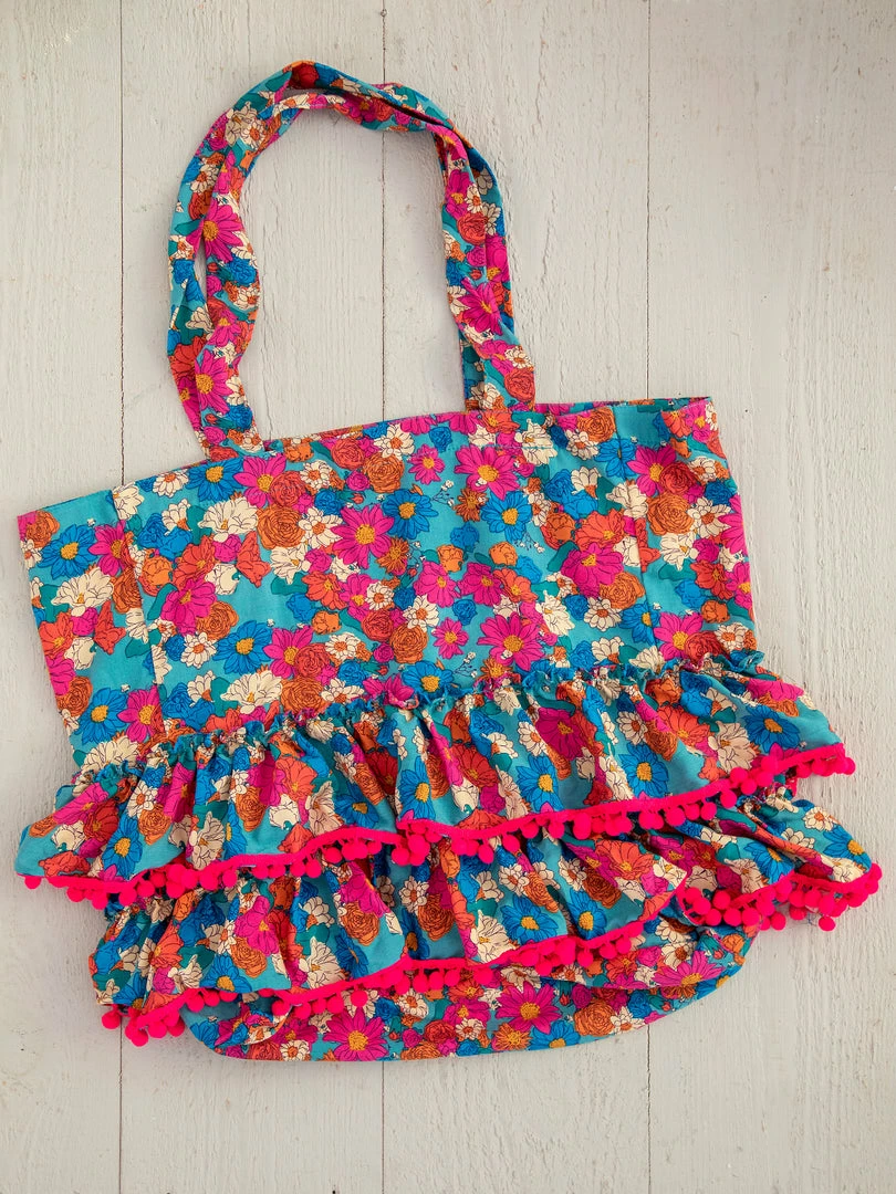 The Ruffle Tote Bag is so fun with its fun print, cute little pom-poms and layered ruffle details. It’s generously sized so you can fit everything you need inside and makes the perfect beach bag or everyday tote!