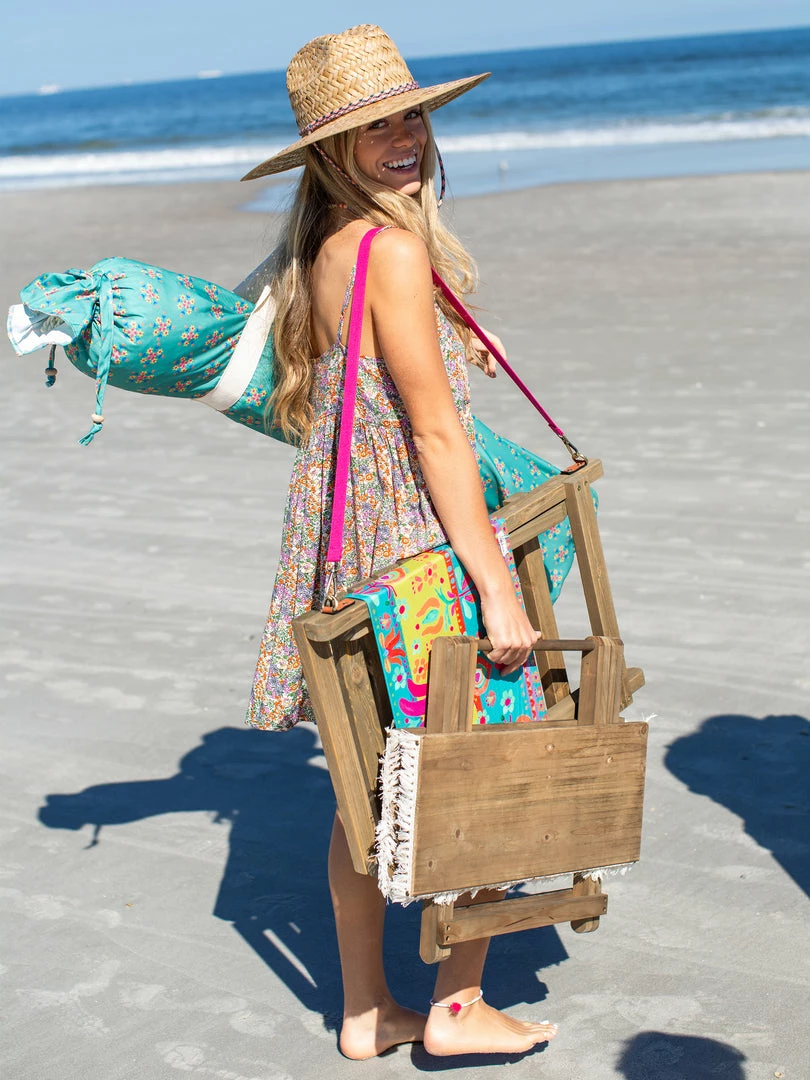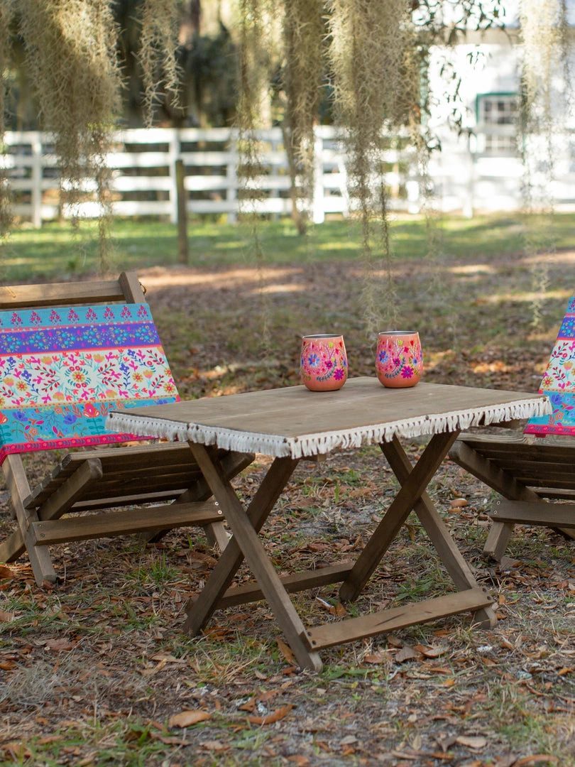 A tiny foldable picnic table you can take anywhere! When it’s folded up, the handle makes it so easy to carry to the beach, picnics or even to your backyard for a tea party! We had to give it a bohemian flare with the cream fringe details… and it’s so cute! We love using this little table with floor pillows, inside or outside!