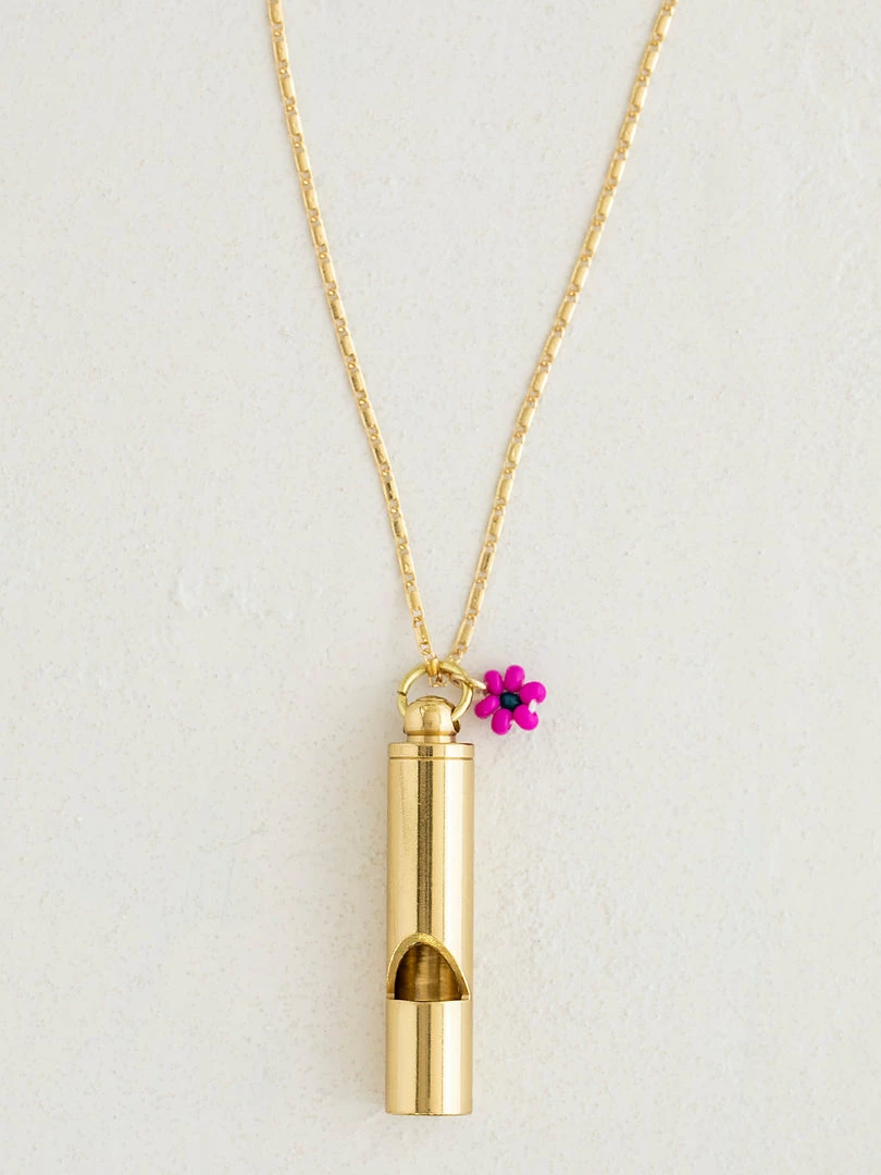 The Whistle Necklace is so cute and functional! Not only does it look pretty on, but it’s also for security and even for calling your dogs! It’s gold plated and features a fun little hand beaded daisy charm! It’s our go-to gift, especially for people with puppies… the whistle recall works so well, just whistle and they come!