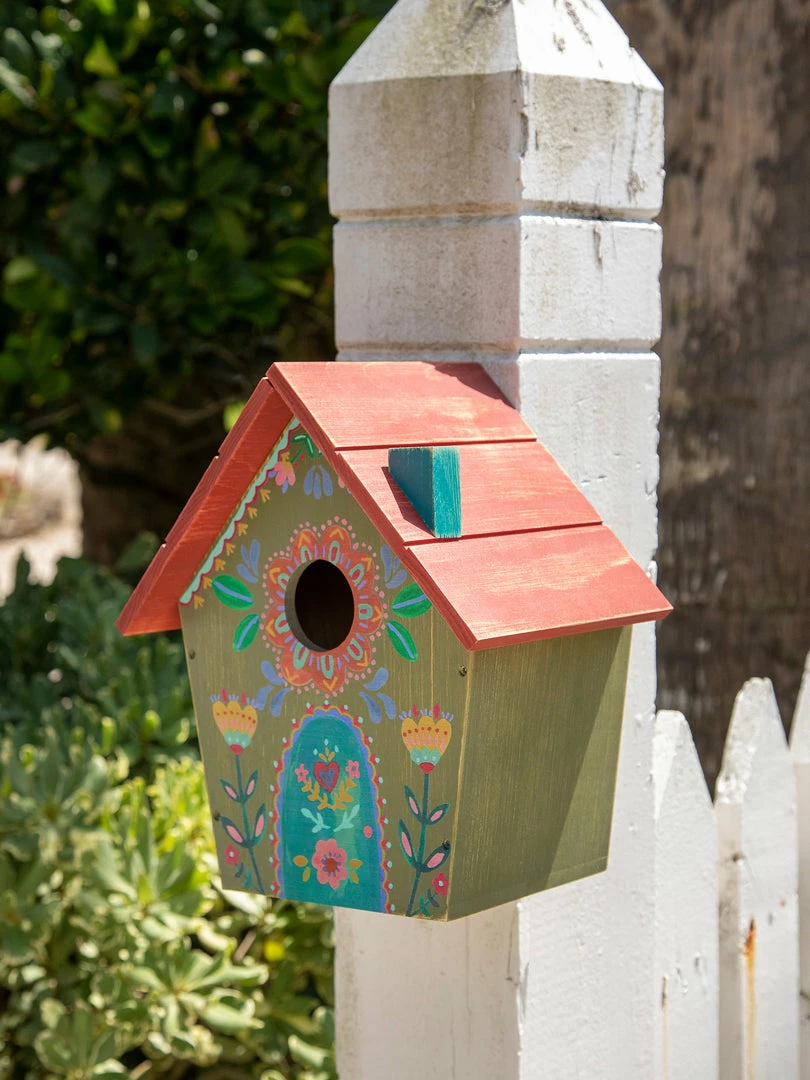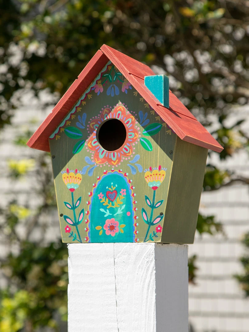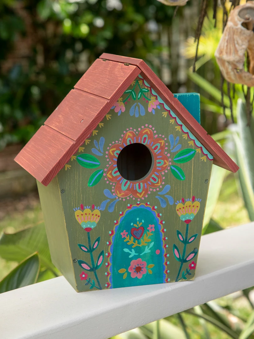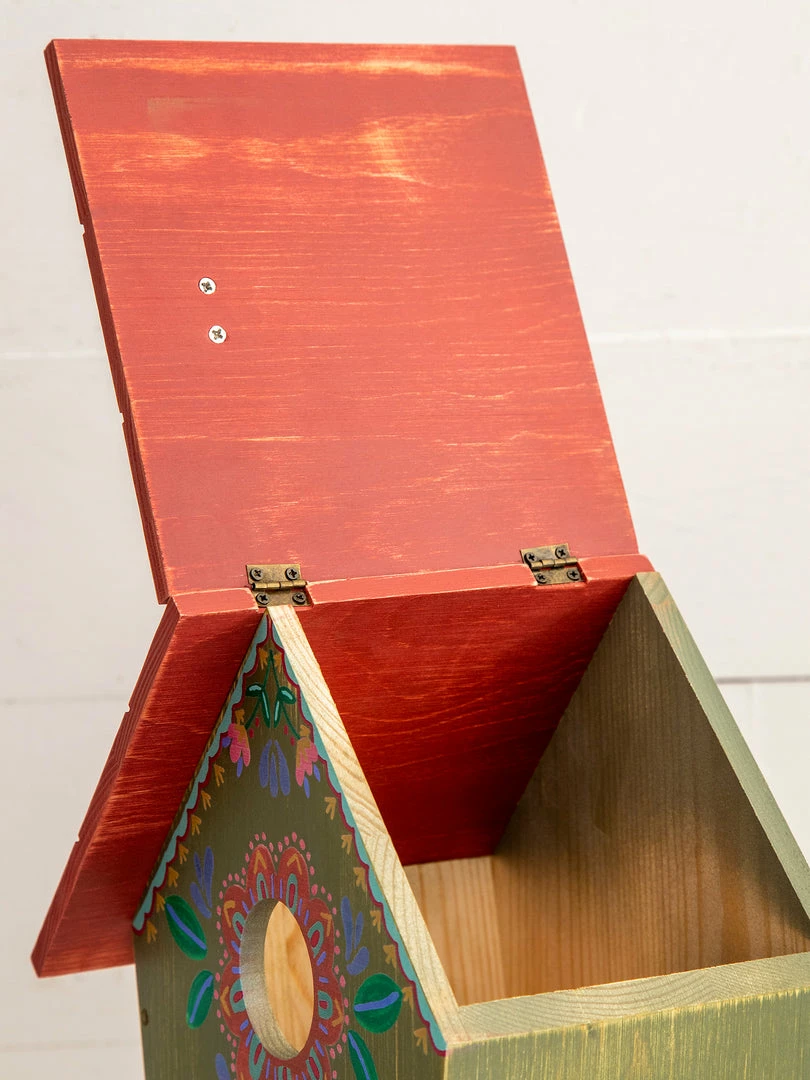 This Wooden Bird House brings us so much joy! We got so inspired on our artist retreat by all the cute bird houses with baby birds inside, it made us want to come back and make our own! It was so much fun making this product and we were mindful of the hole placement and colors to make sure we chose what they want & love in a bird house! It features a round opening and a hinged roof that opens on one side, and a keyhole in the back so you can easily hang it from a tree or post!