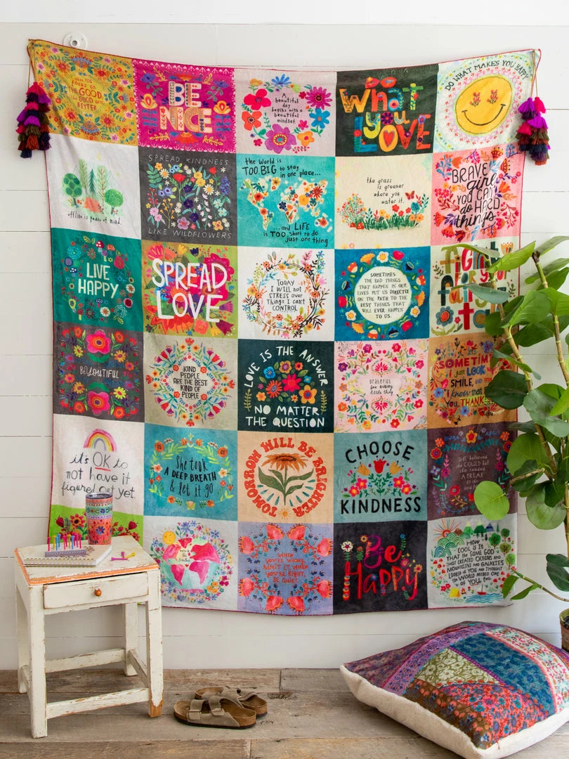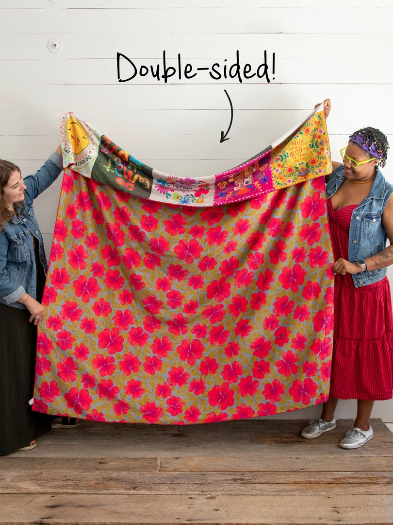 This extra large, double-sided blanket is the softest light-weight fleece and features bright patchwork of all of our most-loved Chirps (the inspirational messages we put in our daily emails & social media posts) on one side and a pretty floral pattern on the other. It’s perfect for snuggling up with a good book, around a camp fire or even just watching your favorite movie on the couch! You’ll want to stay wrapped in it forever!